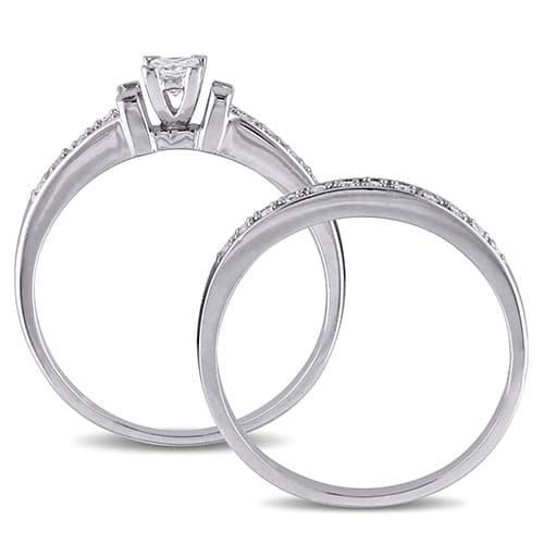 This Loveblooms™ sterling silver Multi-shape 1/3ctw. diamonds bridal ring set features a princess-cut white diamond center stone with accenting round and baguette diamonds. The rings are set in sterling silver and are enhanced with a high polish finish.