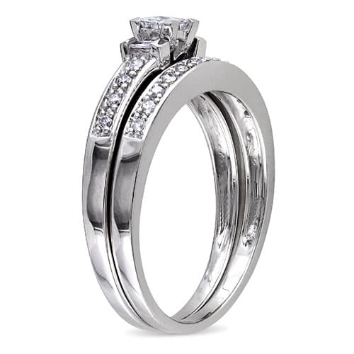 Description This Loveblooms™ sterling silver Multi-shape 1/3ctw. diamonds bridal ring set features a princess-cut white diamond center stone with accenting round and baguette...