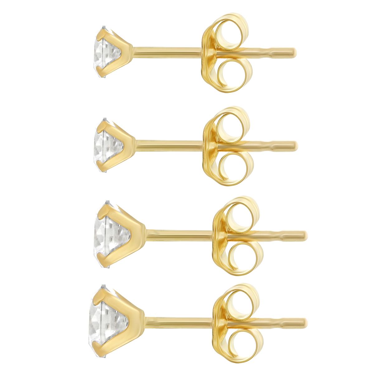 These enchanting 10K Yellow Gold 4 piece singlet set offers a spectrum of dazzling cubic zirconia gems. From the delicate shimmer of 2.2mm studs to the radiant sparkle of 5mm treasures.