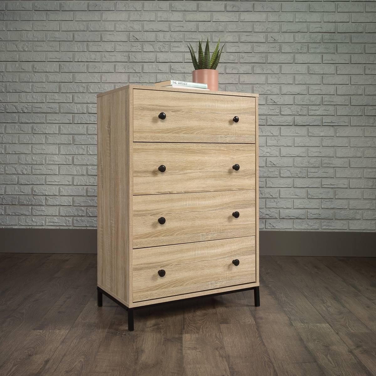 Create the additional storage space you need while adding the style that you love with this Sauder North Avenue collection 4 drawer chest. This wood chest of drawers features four spacious drawers that open and close on smooth metal runners creating a convenient spot for you to stow away a variety of different items. The large top surface provides you with additional space and the chest includes a durable, black metal base. Finished in Charter Oak and detailed with attractive hardware, this bedroom dresser is the solution to your storage woes.