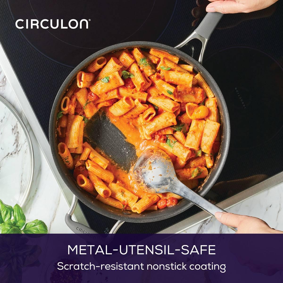 From the inventors of hard-anodized nonstick cookware comes the Circulon A1 Series 5-quart sauté pan with ScratchDefense™ technology. Durable aerospace-grade materials create a thicker and harder surface than ordinary nonstick which will eliminate scratching, sticking, and flaking. Cook with complete confidence using this dishwasher-safe sauté pan with a triple-layer nonstick cooking surface that lasts 130X longer than the competition. The performance-primed and feature-forward sauté pan has a tempered glass lid to lock in heat and drive flavor and is dishwasher-safe and oven safe to 400°F. Even better, the versatile kitchen pan is built with an aluminum core for fast all-over heat delivery and a thick induction-suitable stainless steel base to boost durability and heat retention. Pioneering technology. Extreme durability. Flawless performance. The Circulon A1 Series with ScratchDefense™ technology is complete toughness and re-engineered for total cooking confidence.