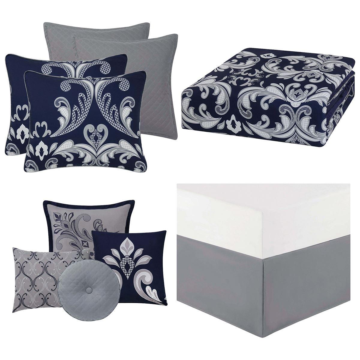 This Style 212 Dolce 10pc. comforter set includes a sharp navy blue background with a repeating scroll pattern. Includes a 15 inch pleated drop that will make a beautiful finishing touch to your bedroom décor.