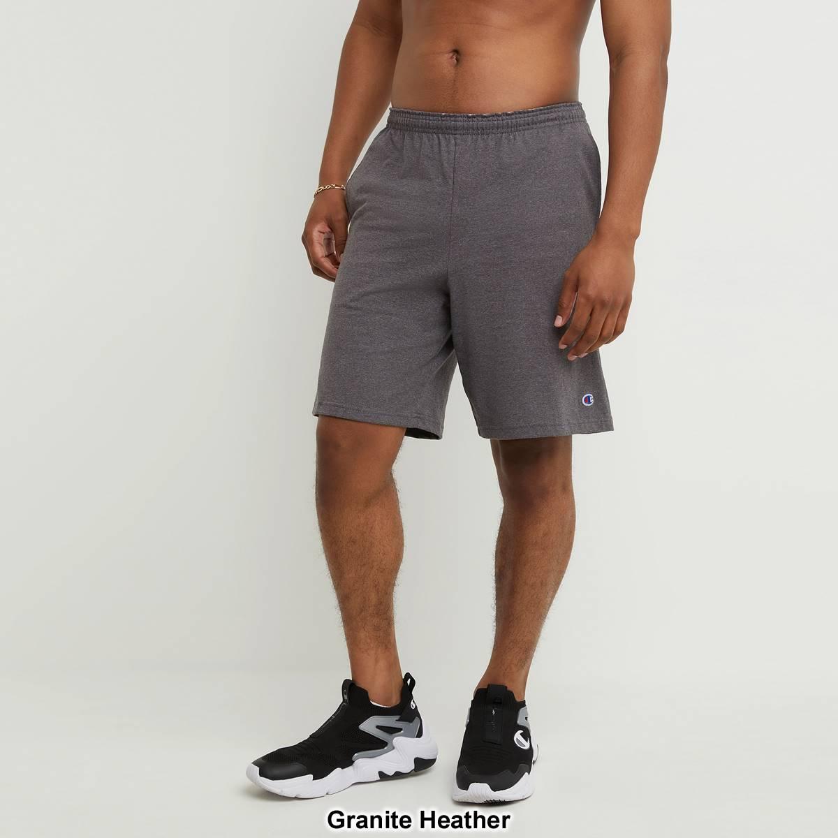 Description These Mens Champion® active shorts have an elastic waistband, side pockets, and a 9-inch inseam. Black and Navy 100% Cotton. Granite Heather 60% Cotton, 40%...