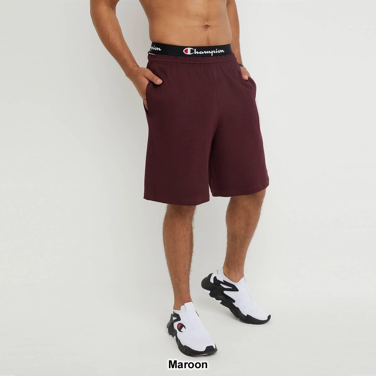 These Mens Champion® active shorts have an elastic waistband, side pockets, and a 9-inch inseam.