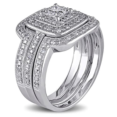 Description This stunning Loveblooms™ sterling silver 3/8ctw. princess and round diamonds bridal 3 ring set features a gorgeous engagement ring with princess white diamonds in...