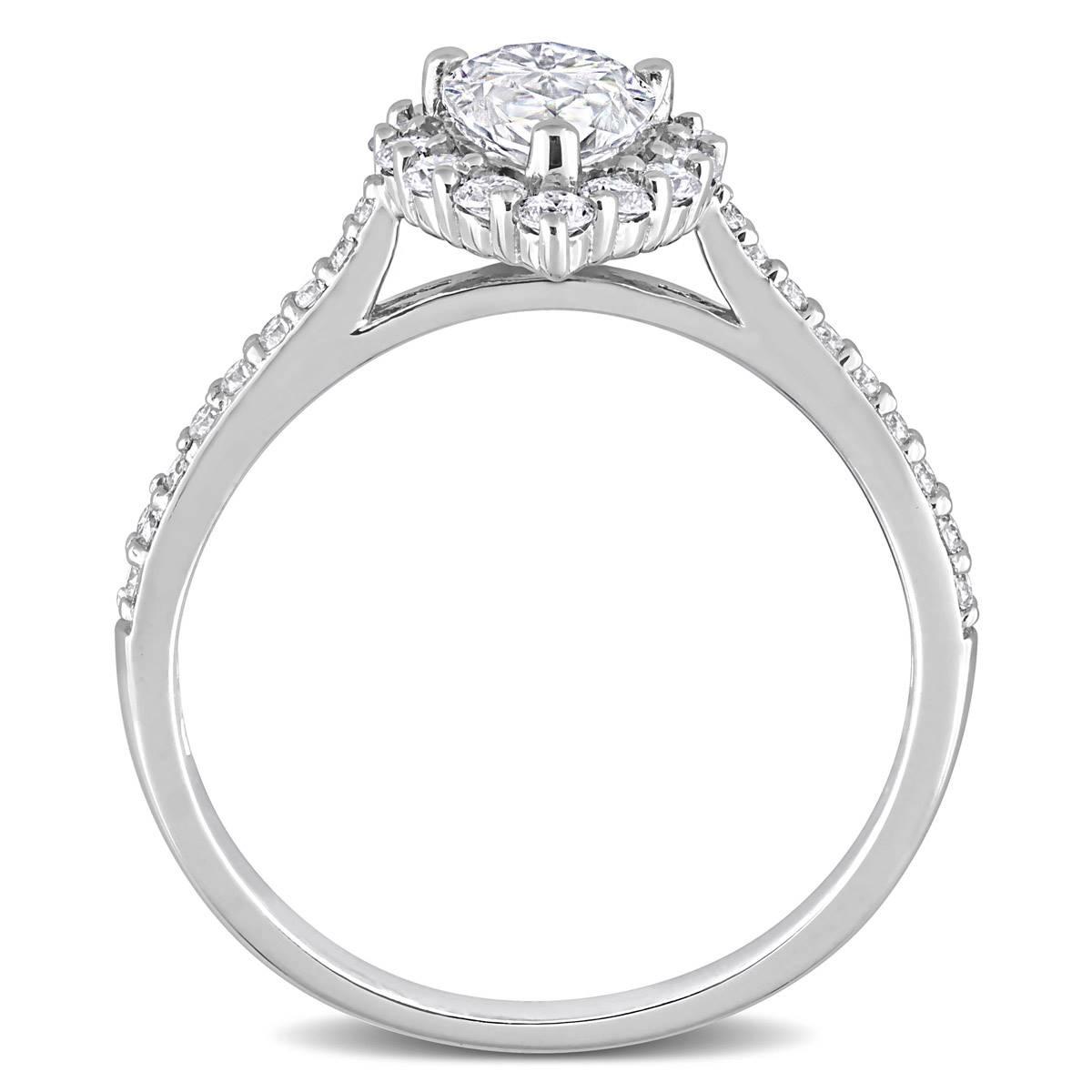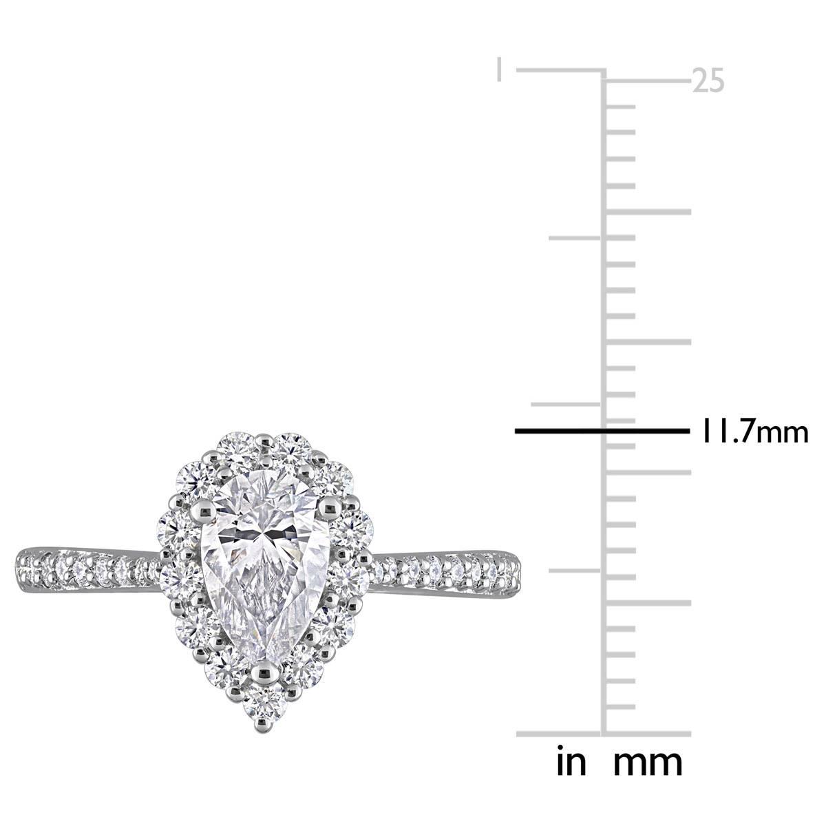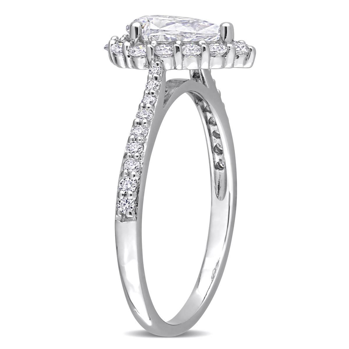 This elegant Gemstone Classics™ wedding ring features a pear-cut, prong-set created white moissanite gemstone at the center with 31 round-cut, prong-set created white moissanite gemstones arranged in a halo and along the band. Enhanced with a high polish finish, this fancy-cut bridal ring portrays a feminine and graceful charm to it without being overdone.