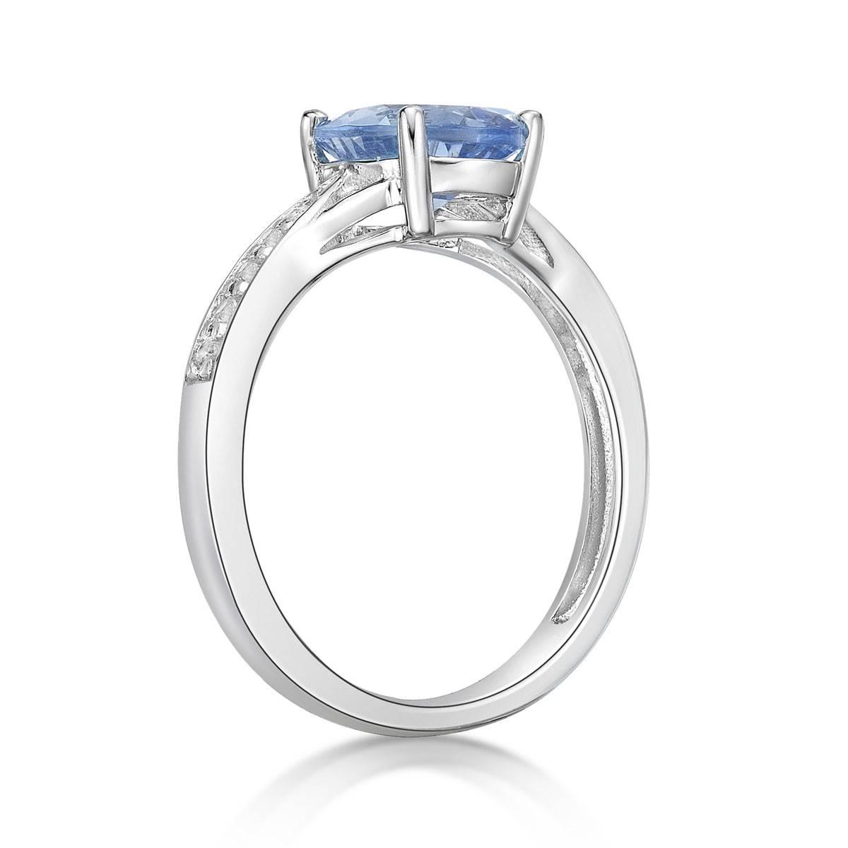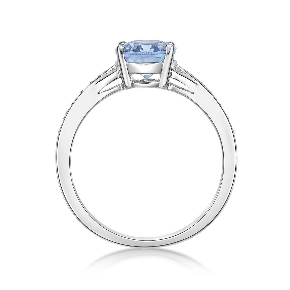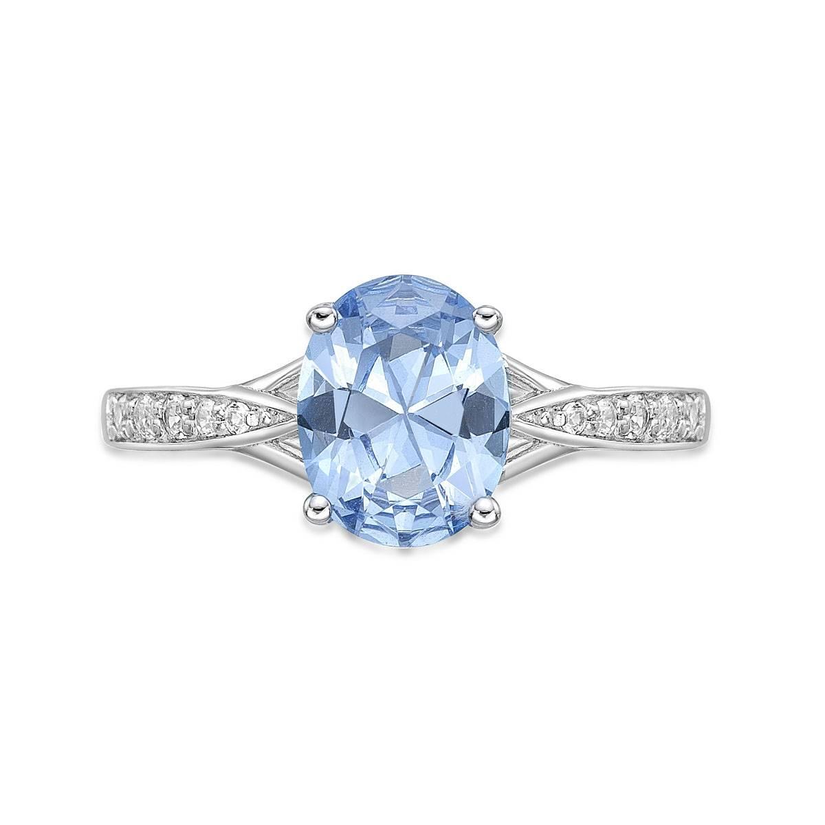 Crafted in sterling silver, this eye-catching ring features a dazzling 9x7mm oval-shaped lab-created bright blue aquamarine center stone. Glimmering white topaz accents decorate the ring´s exquisite shank. A splendor to behold, this gorgeous design is the perfect choice for any special occasion.