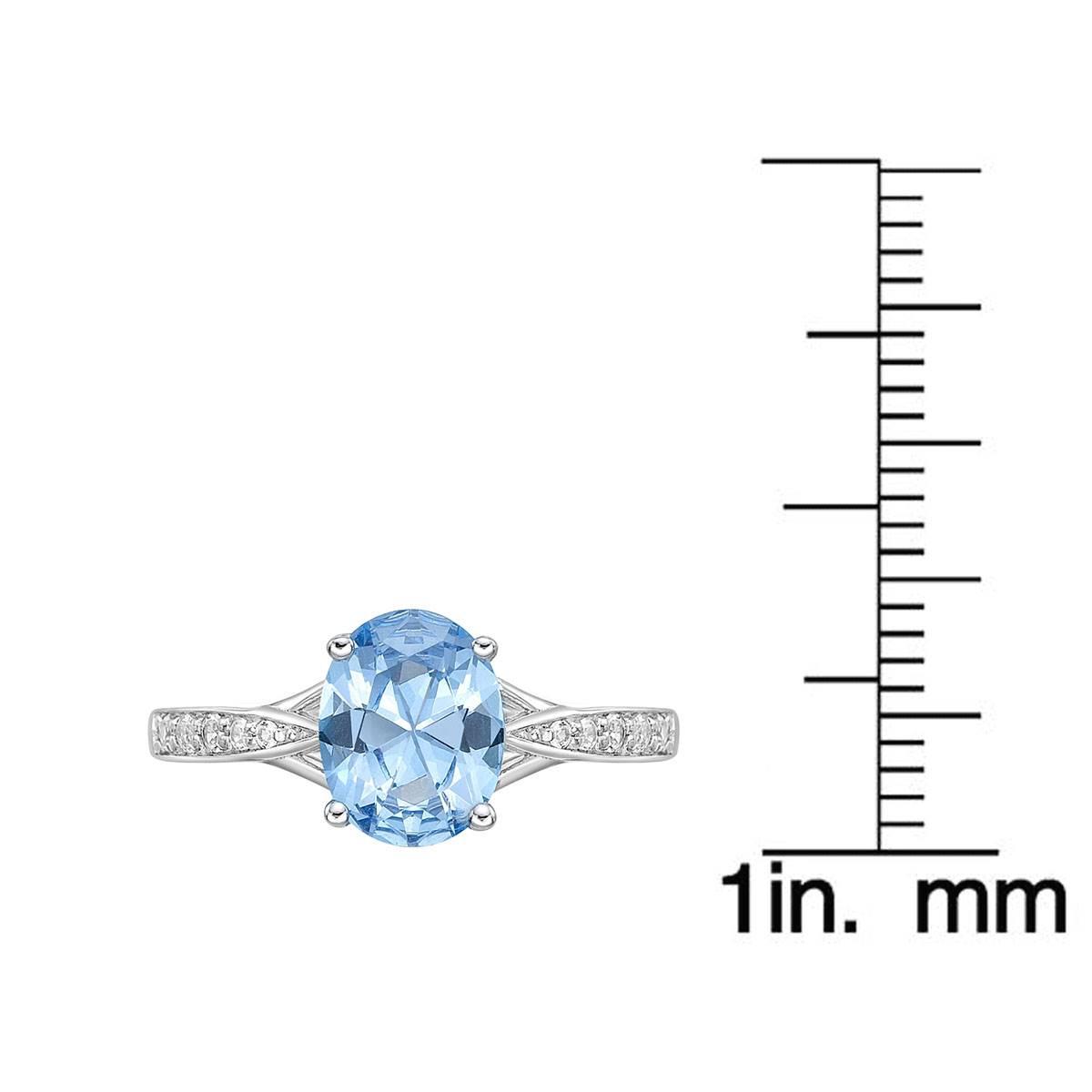 Description Crafted in sterling silver, this eye-catching ring features a dazzling 9x7mm oval-shaped lab-created bright blue aquamarine center stone. Glimmering white topaz...