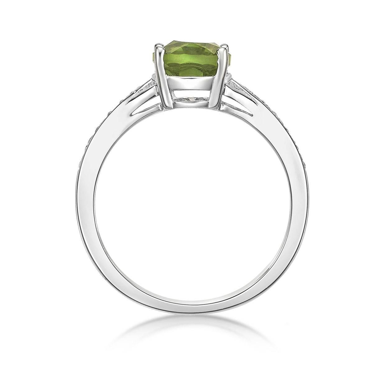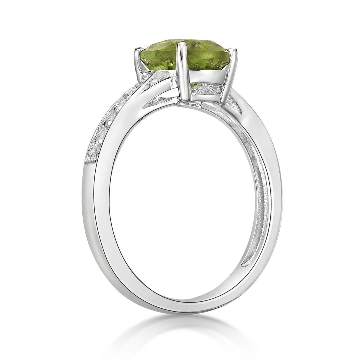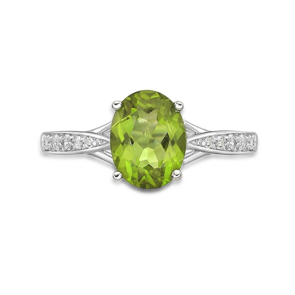 Crafted in sterling silver, this eye-catching ring features a dazzling 9x7mm oval-shaped genuine green peridot center stone. Glimmering white topaz accents decorate the ring´s exquisite shank. A splendor to behold, this gorgeous design is the perfect choice for any special occasion.
