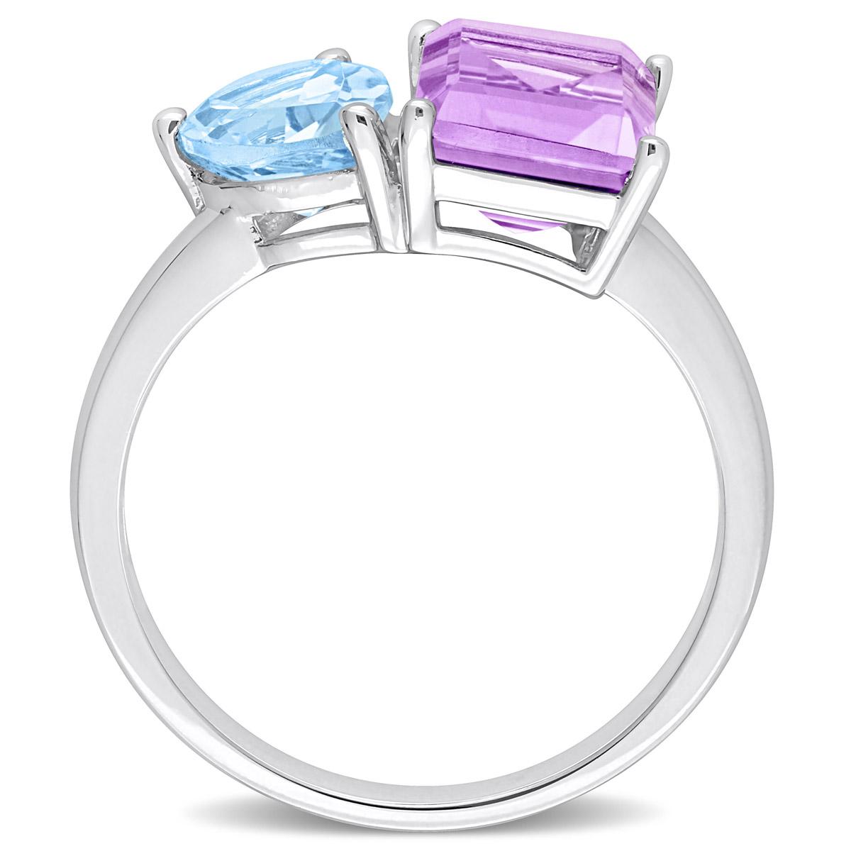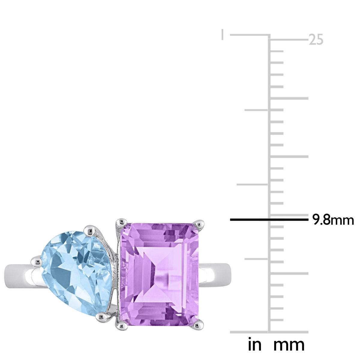 Accessorize boldly with this vibrant Gemstone Classics™ pear sky blue topaz octagon pink amethyst 2-Stone Toi et Moi Ring. Crafted in lustrous sterling silver, this Toi et Moi style ring showcases one pear-cut prong-set sky blue topaz and one octagon-cut prong-set pink amethyst gemstone studded elegantly on a sleek band. Enhanced with a brilliant finish, this beautiful ring is ideal for a flattering look.