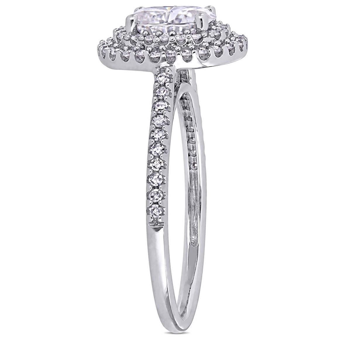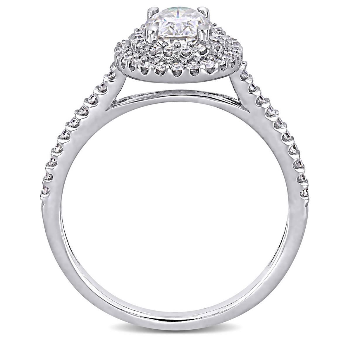 This unique Diamond Classics™ moissanite engagement ring is crafted in 14kt. white gold and features an oval-cut, prong-set created white moissanite stone at its center with 64 round-cut, buttercup-set diamond double halo studded band design. With exquisite luster and incredible shine, choose this style for your bride-to-be as you celebrate this special milestone and begin the next stage of your lives together.