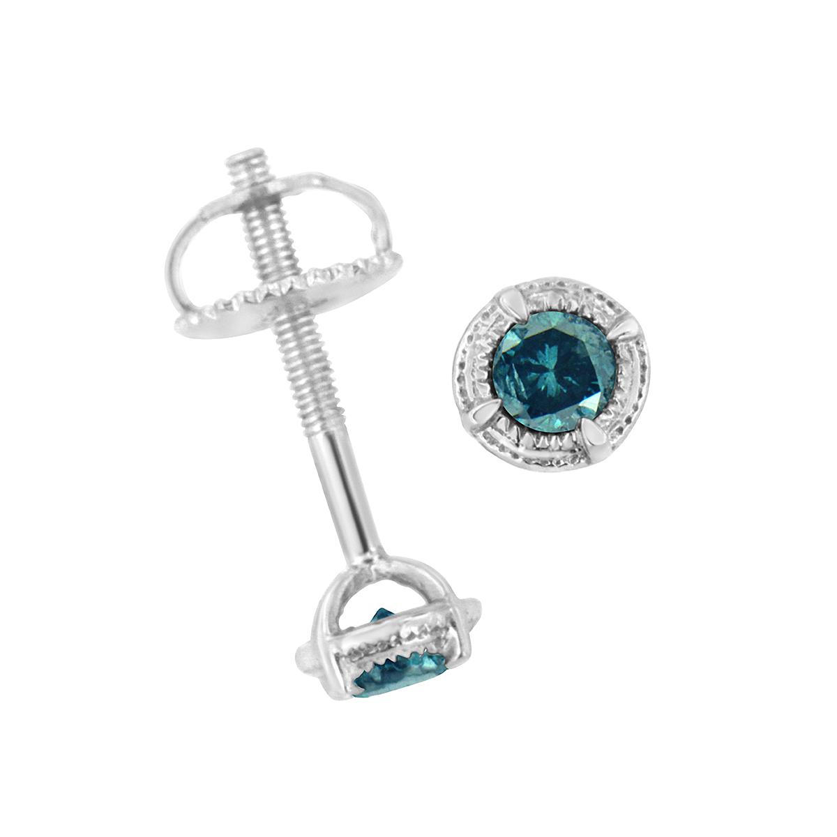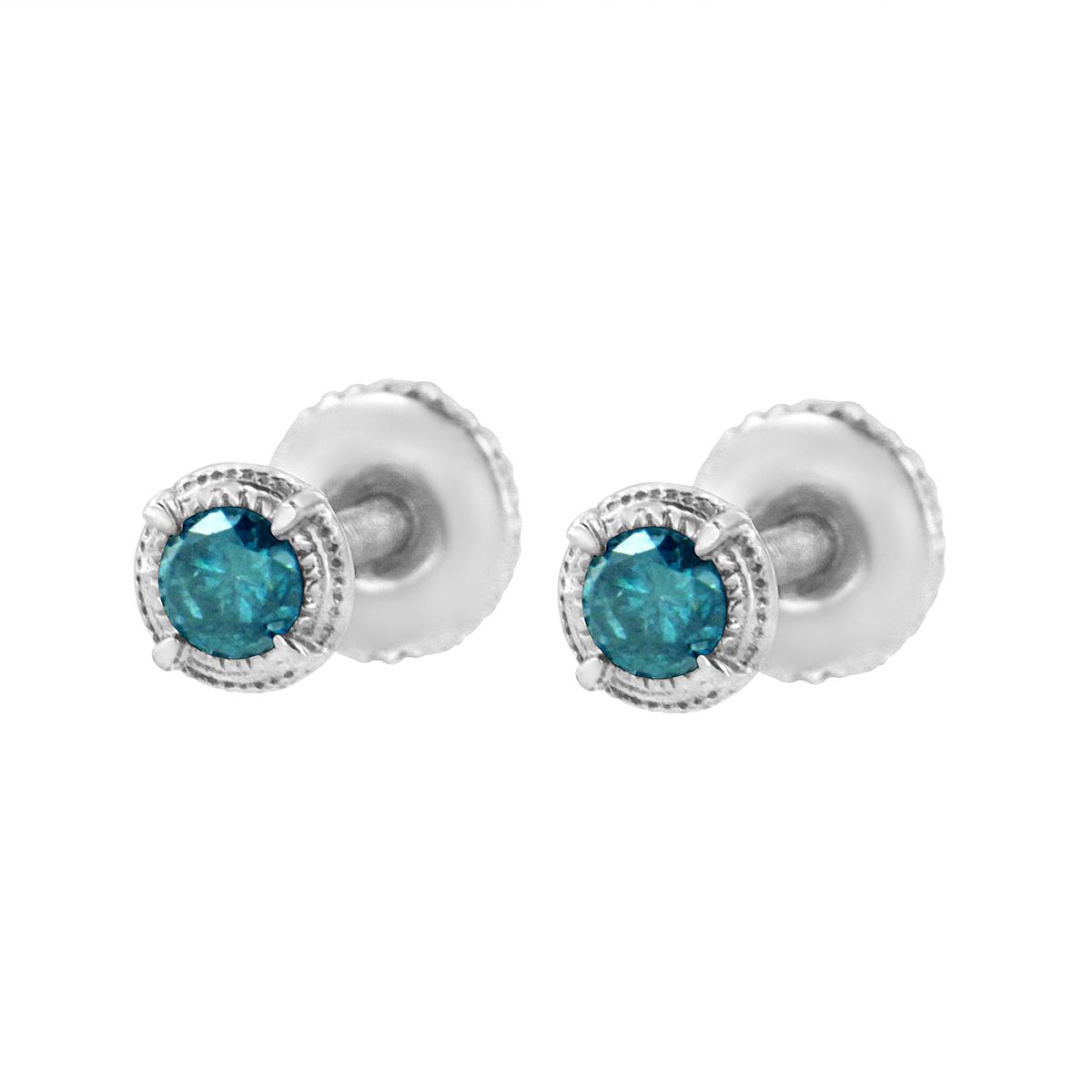 Add this pair of Radiant Rainbow™ 1/4ctw. blue diamond stud earrings to your jewelry collection and impress all your girlfriends. This beautiful pair of studs are made from the finest sterling silver and are embellished with treated, blue round-cut diamonds in a prong setting. Wear this to a black-tie event or a casual dinner out and enjoy the glamour it provides.