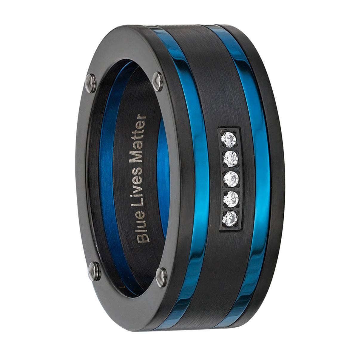 Support the men in blue with this stylish Mens Lynx stainless steel Blue Lives Matter ring, that is perfect for any active man. This ring is outlined with two thin blue lines and crafted in strong stainless steel with black ion-plating. Cubic zirconia accents are neatly placed in the middle of the stainless steel base to give this ring an edgy and polished look you´ll love.