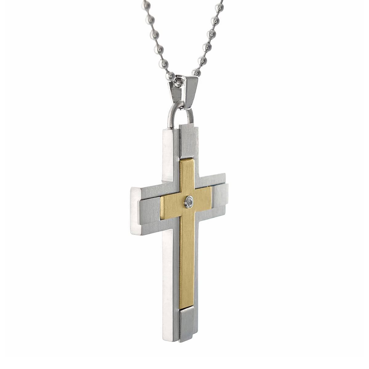 Mens Lynx stainless steel cross pendant with 1/8ctw. diamond and gold-tone ion-plating on a ball chain.