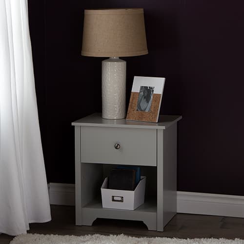 Description This South Shore Vito Soft Grey 1-Drawer Nightstand with its oh-so-trendy finish is the ideal solution for rounding out your bedroom set! If you like an eclectic...
