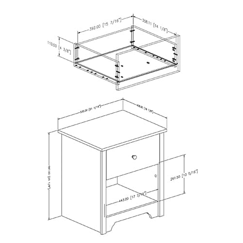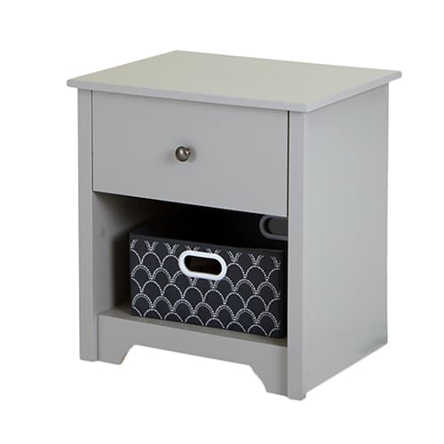 This South Shore Vito Soft Grey 1-Drawer Nightstand with its oh-so-trendy finish is the ideal solution for rounding out your bedroom set! If you like an eclectic look, combine it with dazzling colors. The elegant metal handles are in an antique nickel finish. Can easily be combined with furniture in other finishes. For your children’s safety and your own: plastic drawer slides with safety stop and dampers. Dimensions: 23.25”H x 21.25”W x 17”D.