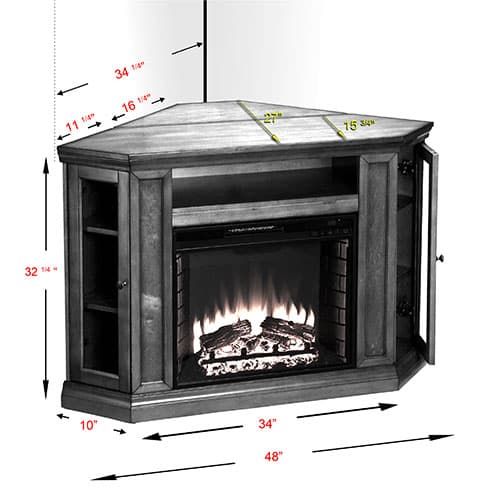 This Southern Enterprises black convertible media electric fireplace features triangular media cabinets on either side of the firebox and they provide plenty of space for your favorite media selections. The media shelf above the firebox is complete with convenient cord access and the mantel is also designed with a collapsible panel, allowing for versatile placement against a flat wall or corner in your home. The firebox has realistic, multicolor flickering flames and glowing embers with an interior brick design for a more lifelike look. It has energy efficient LED and requires no professional installation, making it a cost effective way to upgrade your living or media room. The easy to use remote control offers 4-way adjustability to warm the room conveniently and the safety features include automatic shutoff and glass that remains cool to the touch. Made with poplar, MDF, particle board and 4mm tempered glass. Dimensions: 32.3”H x 48”W x 15.8”D.