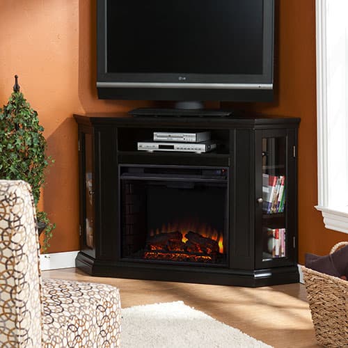 Description This Southern Enterprises black convertible media electric fireplace features triangular media cabinets on either side of the firebox and they provide plenty of space...