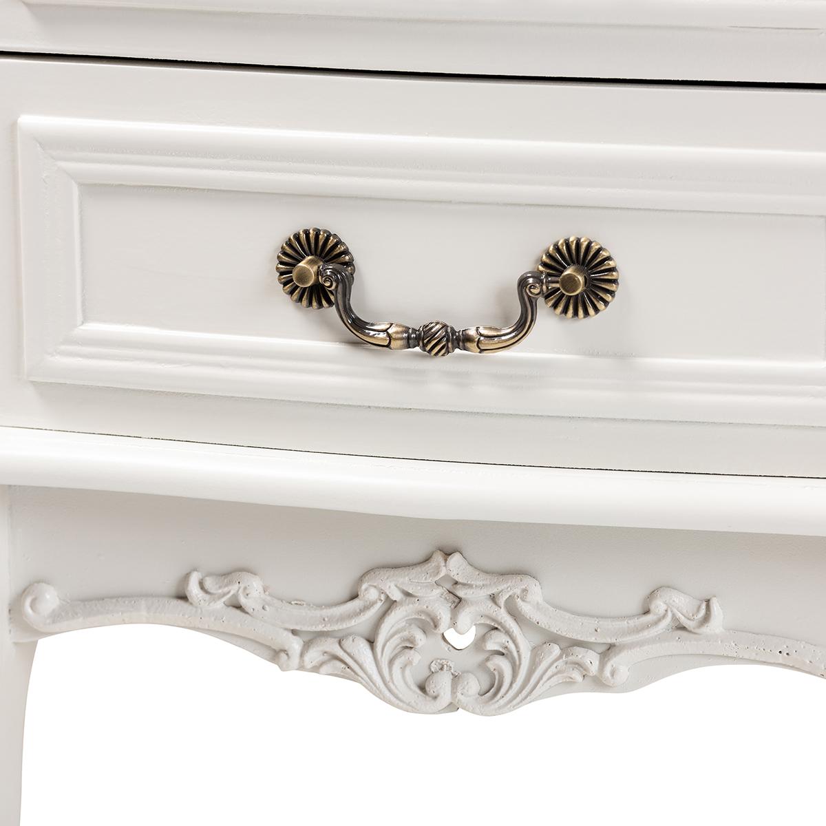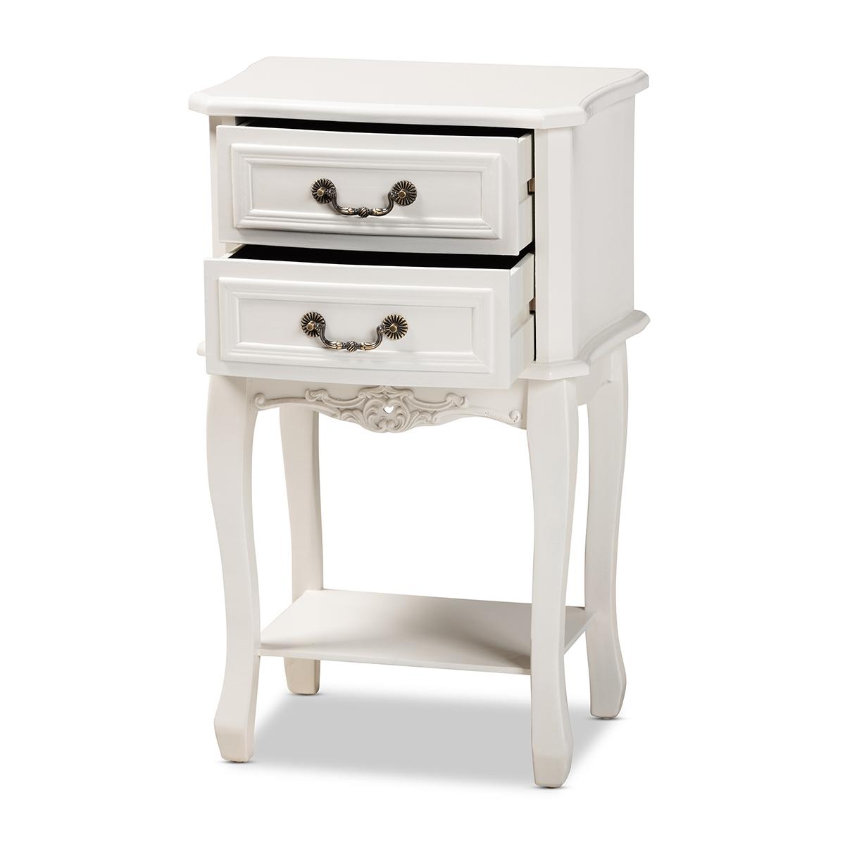 With its floral embellishments, the Baxton Studio Gabrielle nightstand makes a charming bedside companion. Constructed from wood, this nightstand features two drawers and a lower shelf. Its classic white finish highlights the stunning attention to detail in the inset paneling on the drawers, as well as the enchanting floral molding on the bottom. Decorative brass metal handles and cabriole legs add a delightful French-inspired look. This versatile piece is well suited for use as either a nightstand in the bedroom or as an end table in the living room. The Gabrielle nightstand will arrive fully assembled.