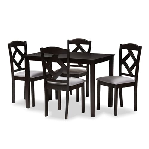 This Baxton Studio Ruth dining 5 piece set is perfect for everyday dinners with family or indulging in a catch-up coffee and cake with friends. It is constructed of solid rubberwood, with dark brown finished dining side chairs that feature geometric design on the chair back for a modern and contemporary look. They chairs have grey polyester fabric upholstered seats, with a foam-filled guarantee for ultimate seating comfort while you enjoying and relaxing with family and friends. The minimalist yet sophisticated table is finished in a chic dark brown.This item requires oversize delivery. Please refer to the Order Summary in the Shipping step at checkout for delivery charge.
