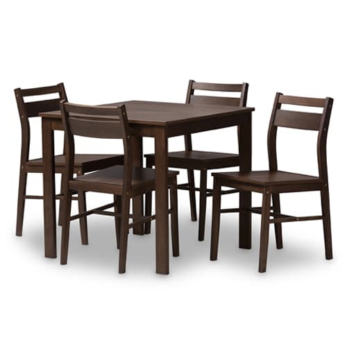 This Baxton Studio Lovy dining 5 piece set packs plenty of style while saving you plenty of space. The modern and contemporary inspired design is easy to coordinate with your existing décor. The table and chairs are built to last out of sturdy rubberwood with a walnut finish. It features a square table top, perfect for playing cards, having brunch, or enjoying a quiet breakfast by yourself. Each chair features an open chair back design with a slight arch for comfort. Made with MDF. Wipe with a soft dry cloth to clean. Dimensions: 29.5"H x 31.5"W x 31.5"D.