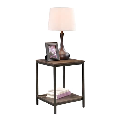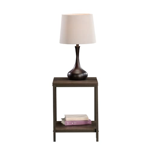 Sauder North Avenue side table features open shelving for storage and display, and it is finished on all sides for versatile placement anywhere in your home. Durable metal frame for stability. Smoked Oak finish.