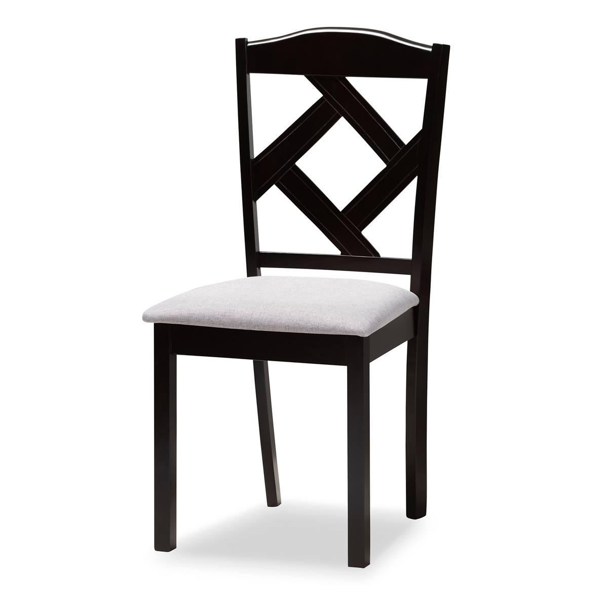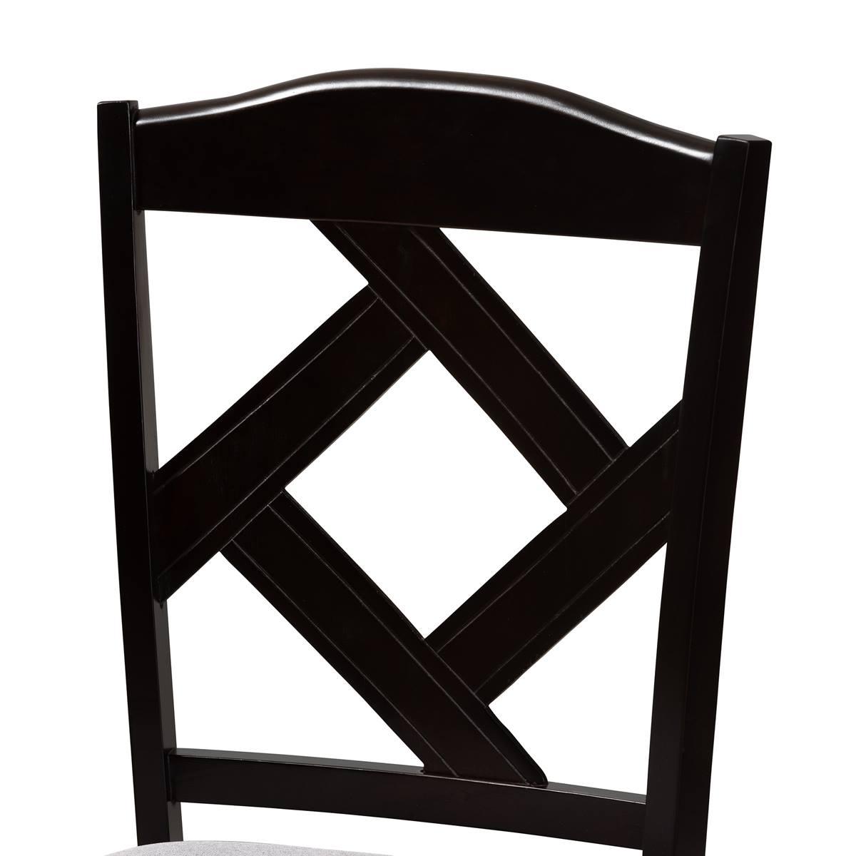 Dine in elegant comfort with the charming Baxton Studio Nesa dining set. Made in Malaysia, this set includes four dining chairs and one table constructed from wood displaying a rich dark brown finish. Each chair features a plush foam padded seat upholstered in soft fabric, as well as a geometric cut-out design on its back, for a striking blend of comfort and style. Requiring assembly, the wide, circular tabletop provides ample elbow room for each member at the table. Perfect for enjoying nights with friends and family, the Nesa dining set elevates any dining experience.