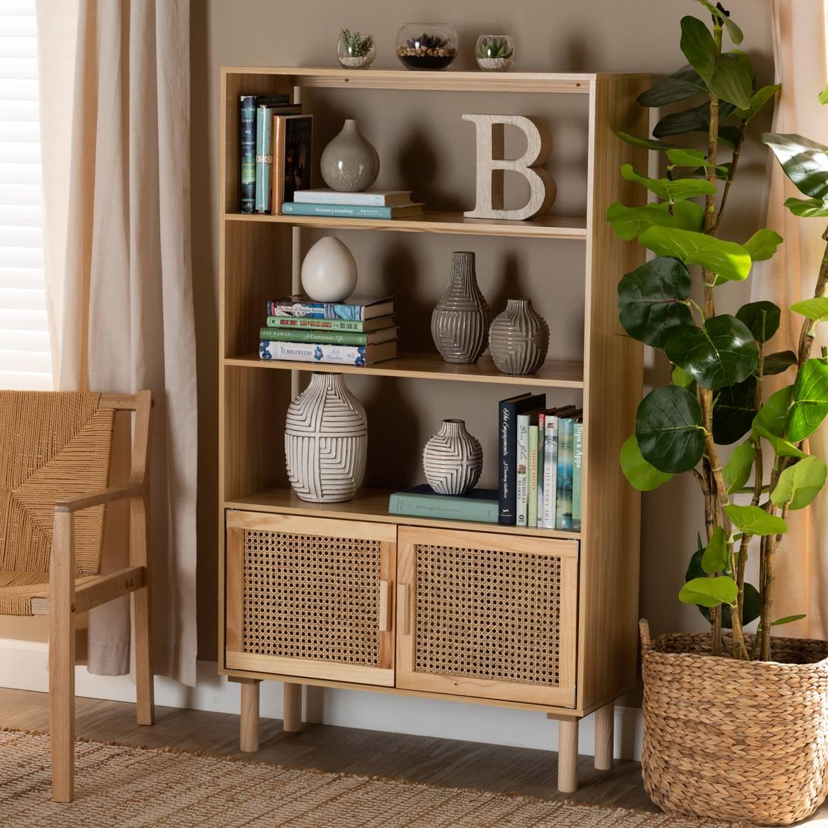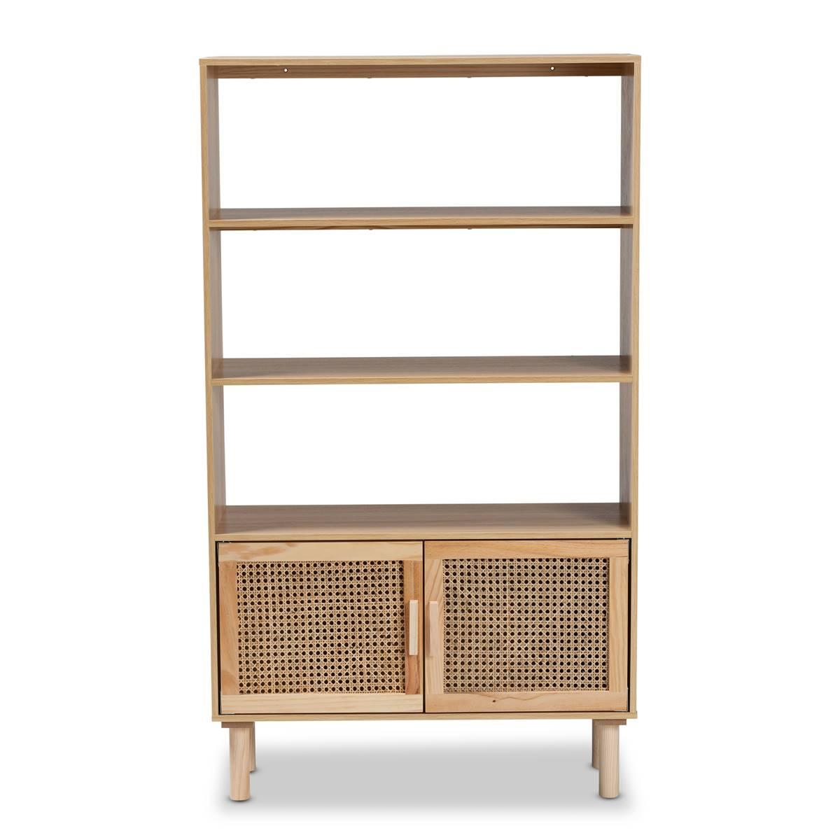 Expand the borders of your interior with the fantastic convenience of the Baxton Studio Faulkner bookcase. Made in China, this handy piece is comprised of a sturdy wood frame accented with rattan. Three open shelves create a stunning display for knickknacks, collectibles, and decorations while a large shelf behind the doors offers more secure storage space. Requiring assembly, the Faulkner is supported by rounded legs for excellent stability and support in mid-century inspired design. An exceptional blend of modern convenience and retro design, the Faulkner bookcase enriches any space.