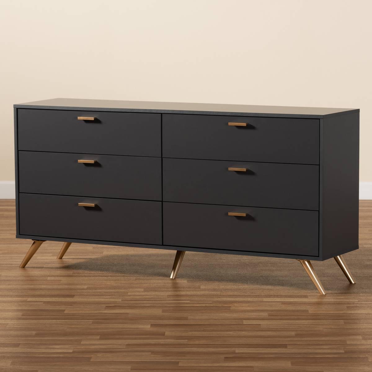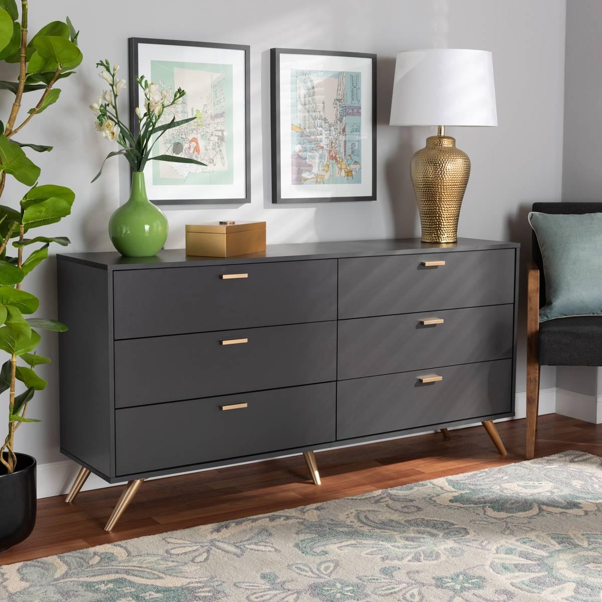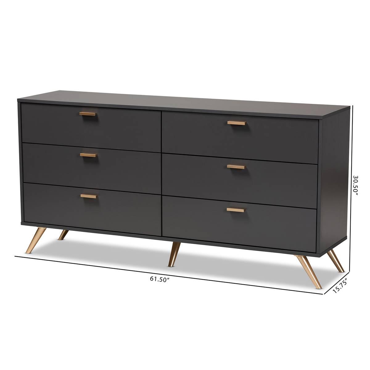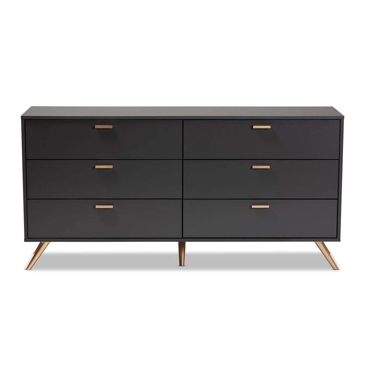 Baxton Studio Kelson Dark Grey & Gold Wood 6-Drawer Dresser