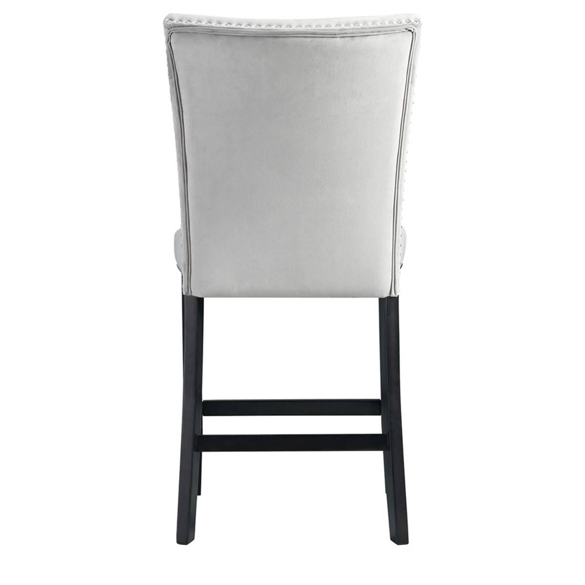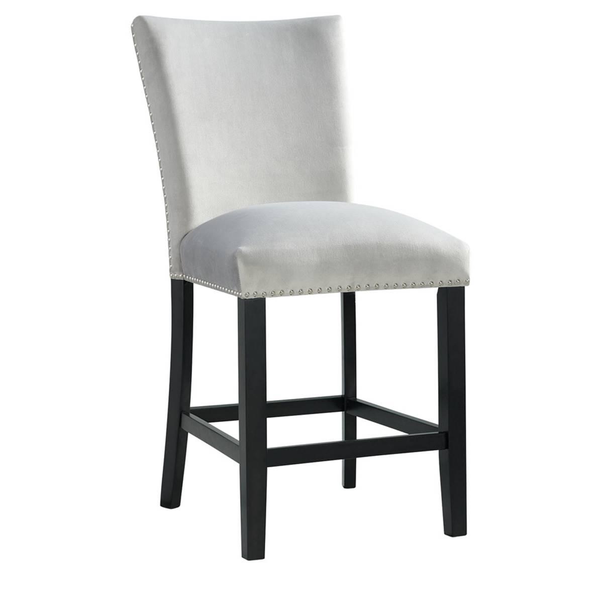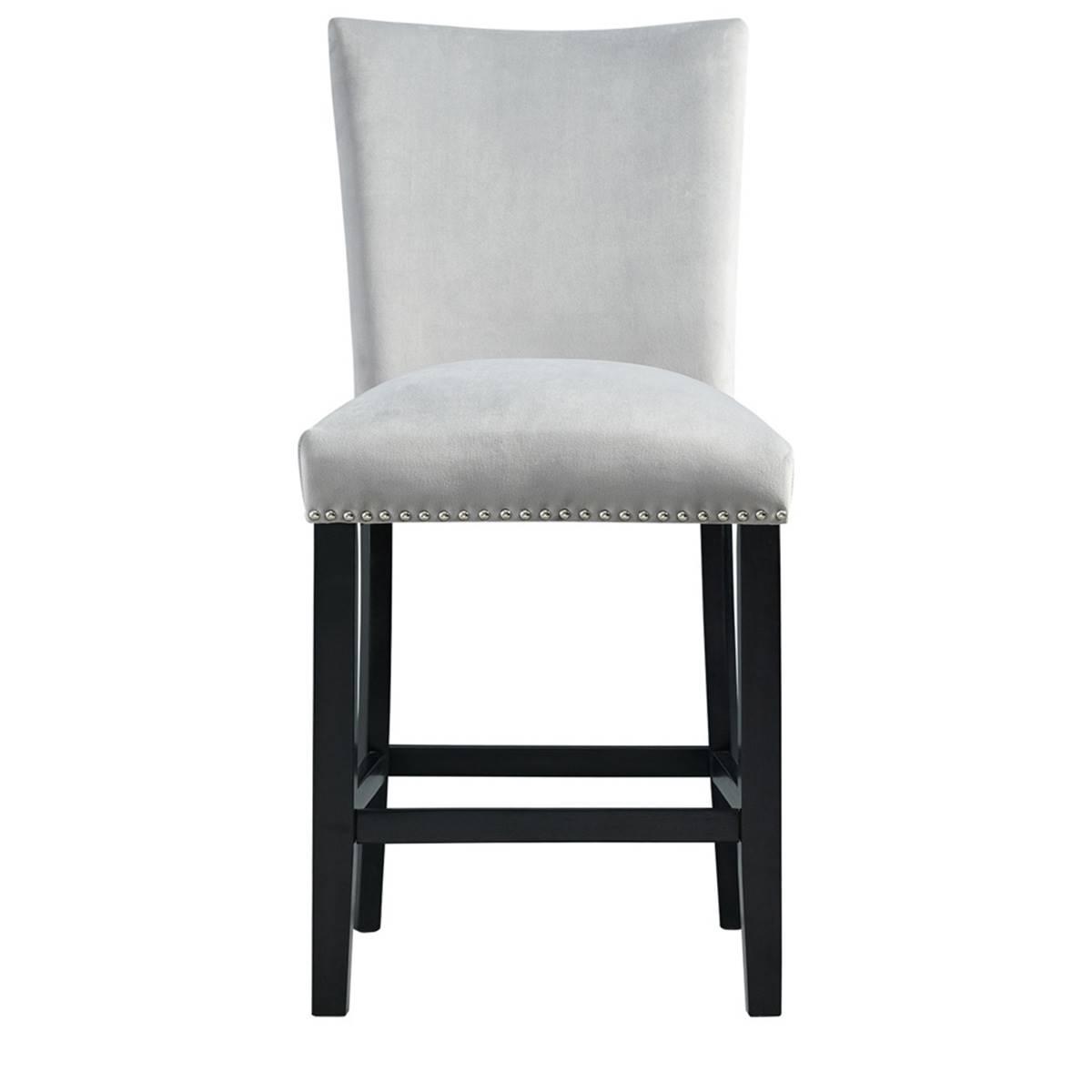 This Elements Francesca grey velvet counter height chair set instantly updates your dining room! This chair set is upholstered in a show stopping grey velvet, which will elevate your dining room to the next level. The chrome nailhead trim outlines the edges of these chairs, adding an extra flair to this already stunning set. The grey velvet pairs beautifully with the sleek black finish on the legs. Add these chairs to your home today for a look that will never go out of style!