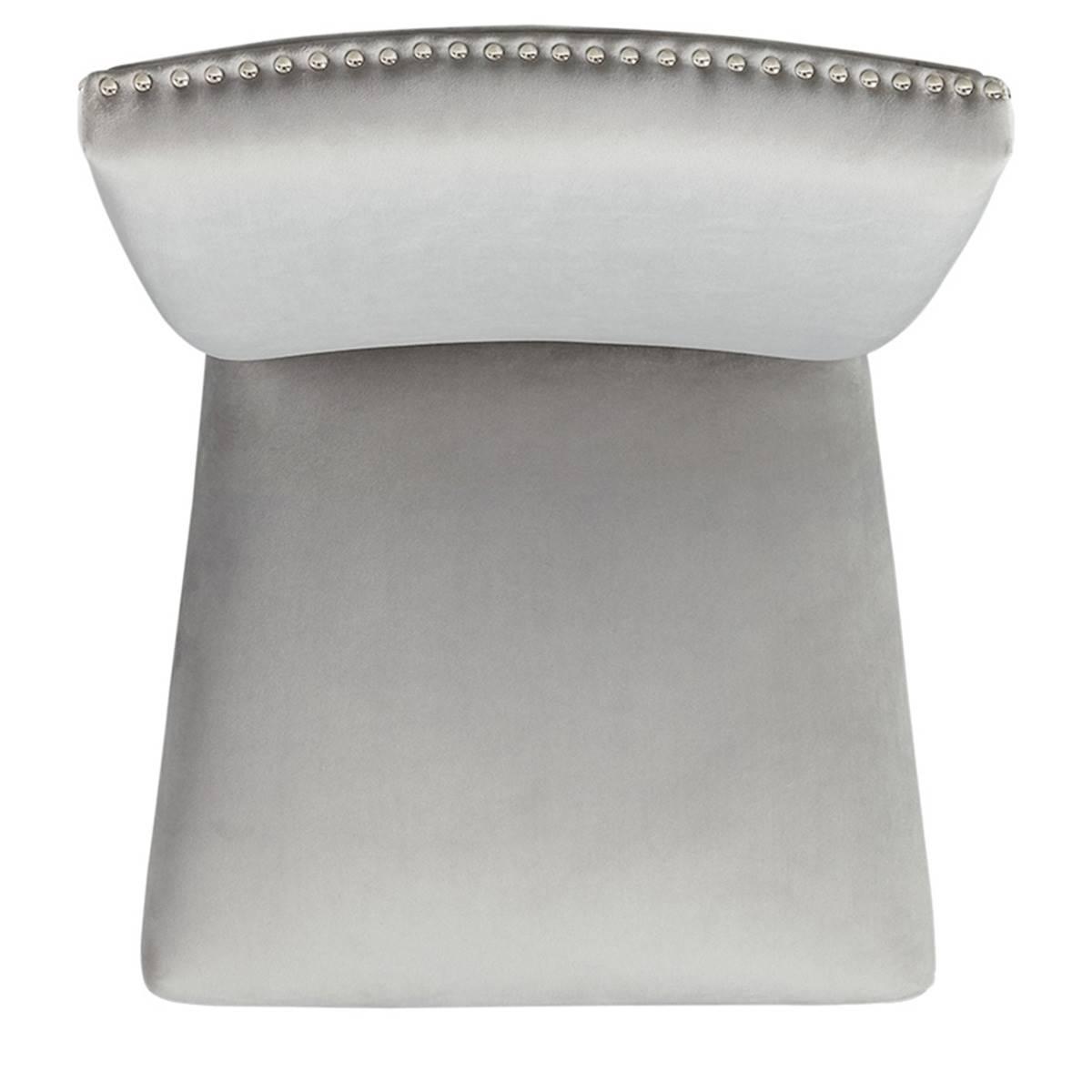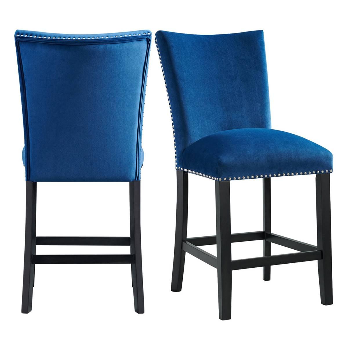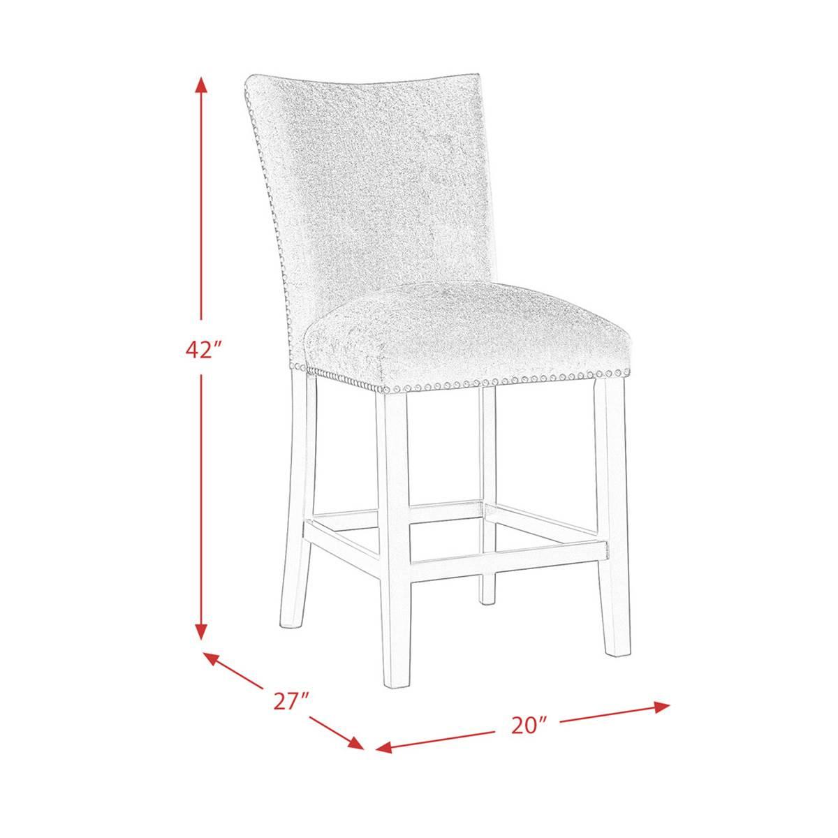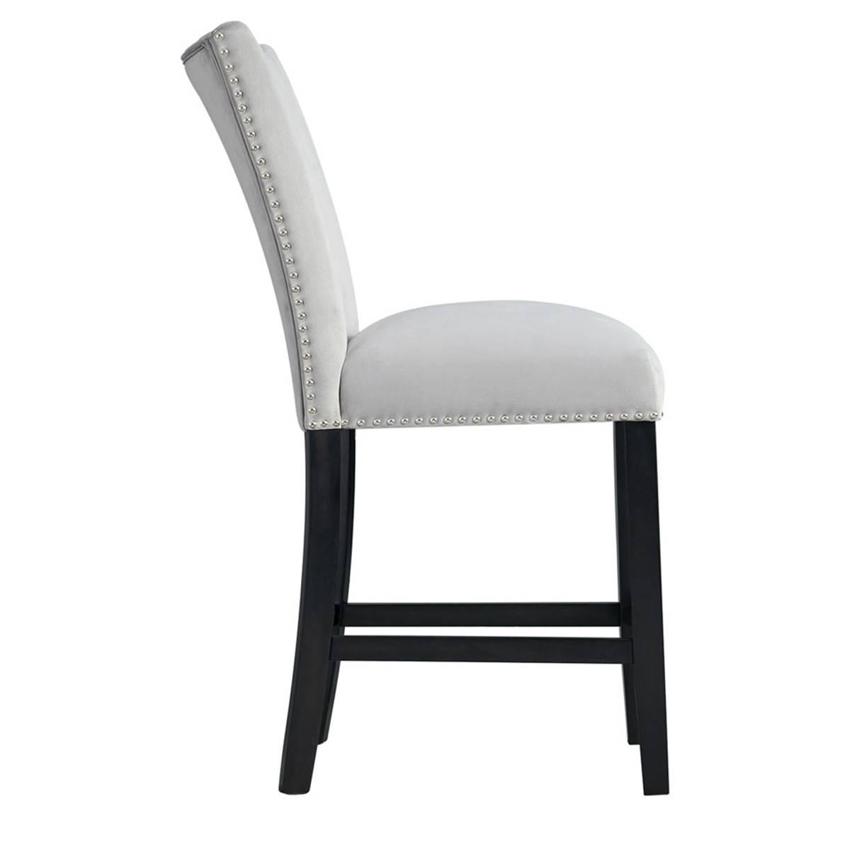 This Elements Francesca grey velvet counter height chair set instantly updates your dining room! This chair set is upholstered in a show stopping grey velvet, which will elevate your dining room to the next level. The chrome nailhead trim outlines the edges of these chairs, adding an extra flair to this already stunning set. The grey velvet pairs beautifully with the sleek black finish on the legs. Add these chairs to your home today for a look that will never go out of style!