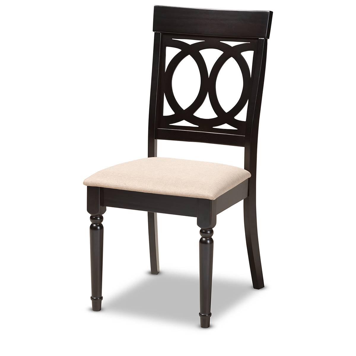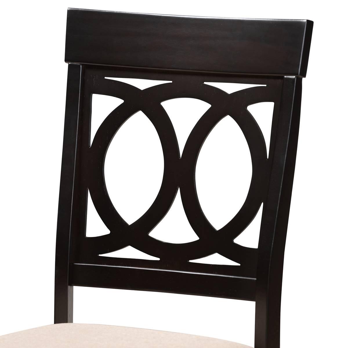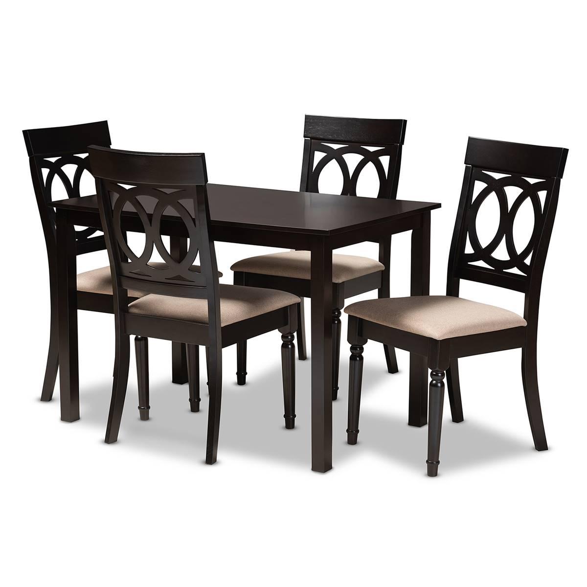 This Baxton Studio Lucie 5 piece wood dining set is a great way to reinvent your dining room! Constructed with solid oak wood, this dining set includes one table and four chairs, each upholstered in a light polyester fabric that complements the rich espresso wood finish. Designed with both comfort and style in mind, each chair features a plush foam-padded seat, as well as an exquisite cut-out design on its back. Saber legs add a classic, refined touch. Built for long dinners with family and friends.