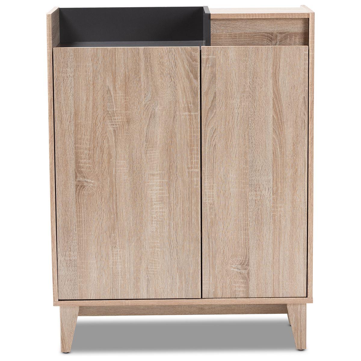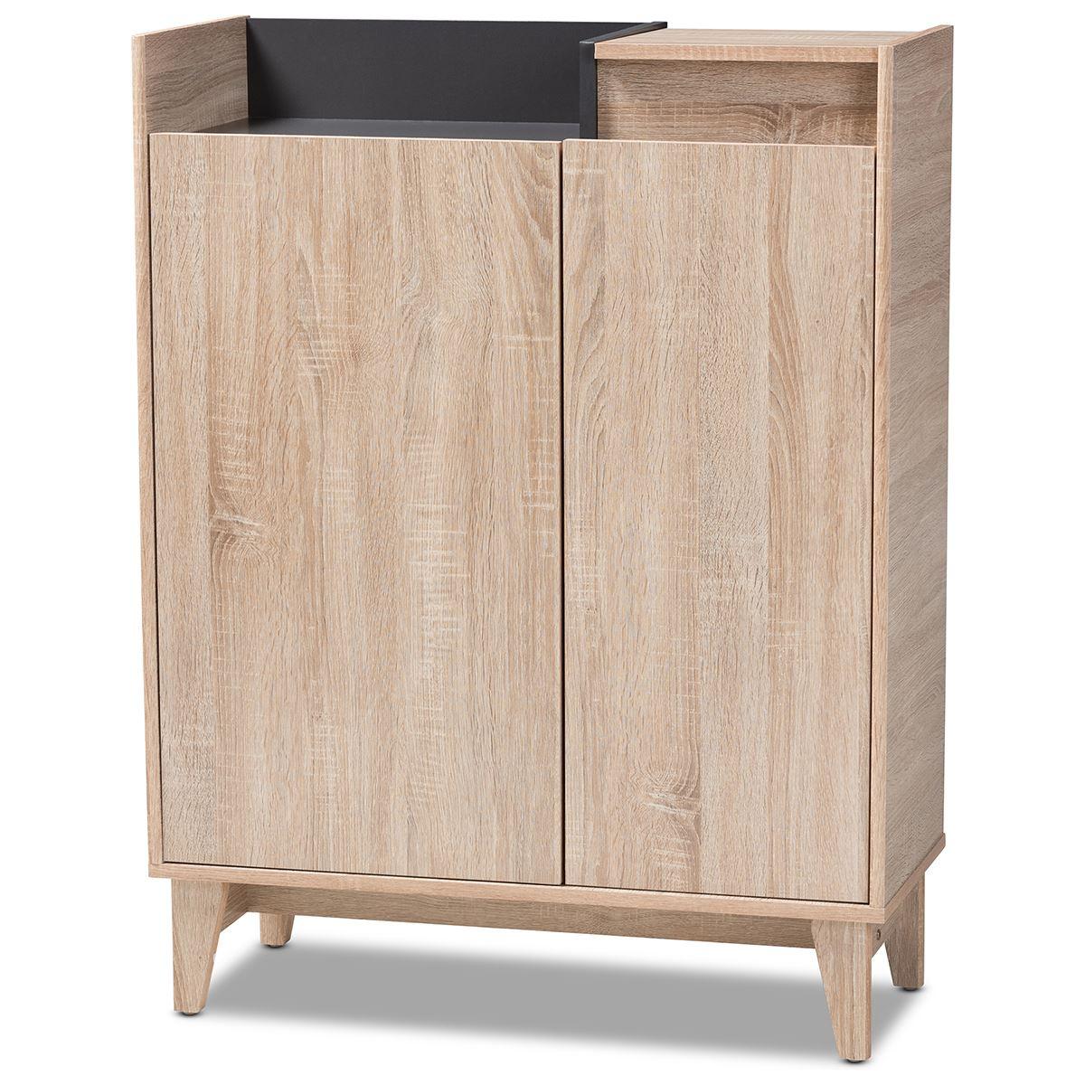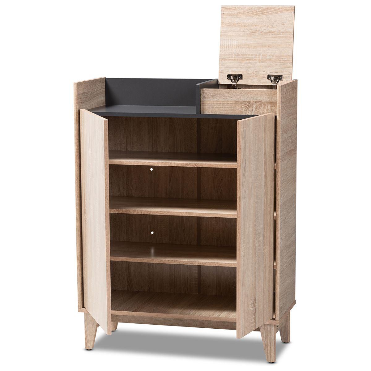 This Baxton Studio Fella entryway shoe cabinet with a lift-top storage compartment is inspired by sleek Scandinavian design. It is constructed from engineered wood and displays a two tone oak and dark grey finish for visual interest. There are 2 doors open to reveal 4 shelves with storage space for up to 12 pairs of shoes. Additional storage space is provided by an open shelf and lift-top storage compartment. Mid-century modern design influence is evident in the angled and tapered legs.
