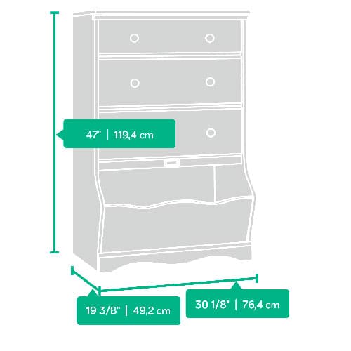 Sauder Pogo 3 drawer chest features drawers with metal runners and safety stops feature patented T-lock assembly system. Storage bin features ID tag. Detailing includes solid wood knobs. Soft White finish. Dimensions: 47"H x 30 1/8"W x 19 3/8"D.