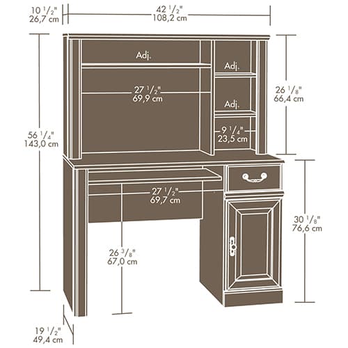 This Sauder Orchard Hills computer desk with hutch has a slide-out keyboard/mouse shelf with metal runners and safety stops and a spacious drawer that features the patented T-lock assembly system. The storage area behind this computer desk’s raised panel door holds a vertical CPU tower. Hutch features three adjustable shelves. This computer desk with hutch has a Carolina Oak finish. Dimensions: 56 1/4"H x 42 1/2"W x 19 1/2"D.