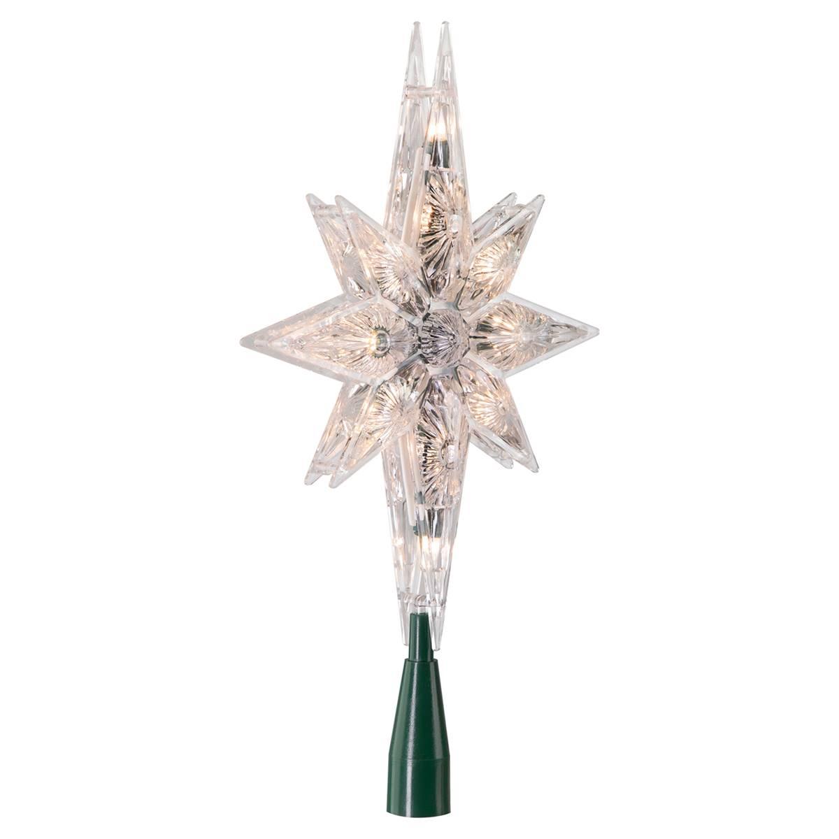 Crown your Christmas tree with this traditional Northlight Seasonal religious style tree topper. A time-honored star representing that which guided the Wise Men to Baby Jesus in Bethlehem. It features 10 clear mini bulbs on a green wire with a 24-inch lead cord. This double-sided design has steady burning bulbs that are UL listed for indoor use only and if one bulb burns out the rest will stay lit. Contains 1 plug with end connector which allows you to stack multiple sets of lights together, not to exceed 210 watts. Comes with replacement bulbs, spare fuse and cone to attach to the tree.