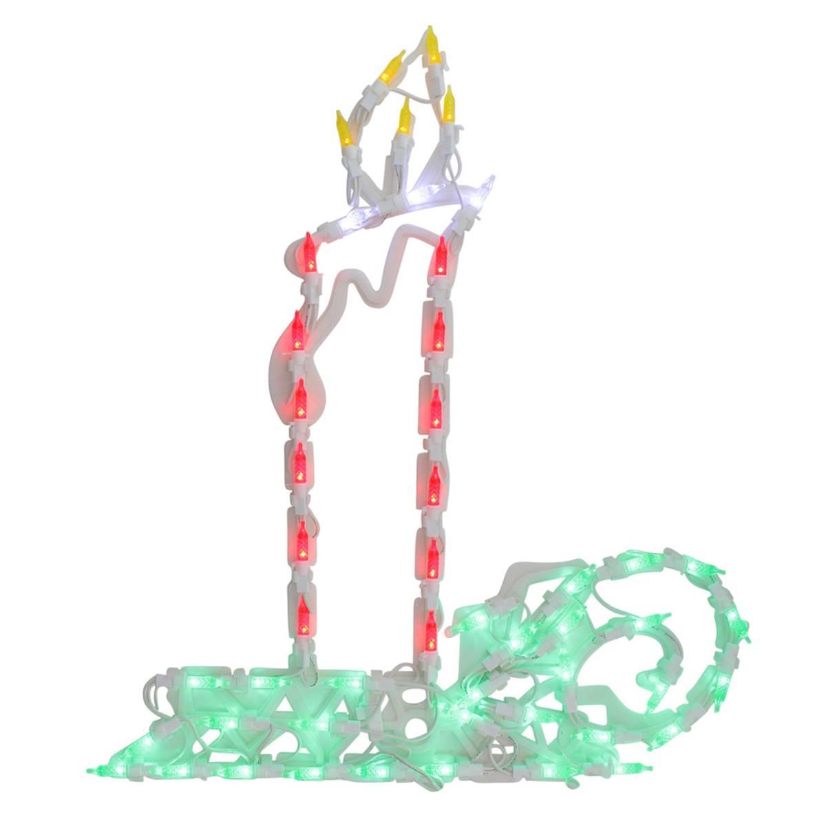 This Northlight Seasonal 17.5 inch LED candle Christmas decoration features 40 M5 mini bulbs in red, green, pure white and amber bulbs on a white wire. Super bright bulbs are guaranteed to light and LED lights to use 90 percent less energy, are cool to the touch and are non-glass bulbs. The lights are UL listed for indoor or outdoor use. This double-sided design comes with replacement bulbs, spare fuses, an easel stand, and suction cup. Contains 1 plug with end connector which allows you to stack multiple lighted items together, but do not exceed 210 watts.
