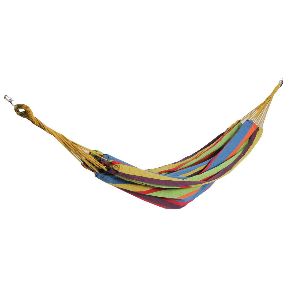 This Northlight Seasonal 72 inch 2 person striped double Brazilian hammock lets you relax in style this summer season. Its woven design features a multi colored striped pattern with the stripes varying in size. It is ideal for hanging between trees, on your balcony, or in a hammock stand. The U-shaped support and tied loop knots are for strength and durability.
