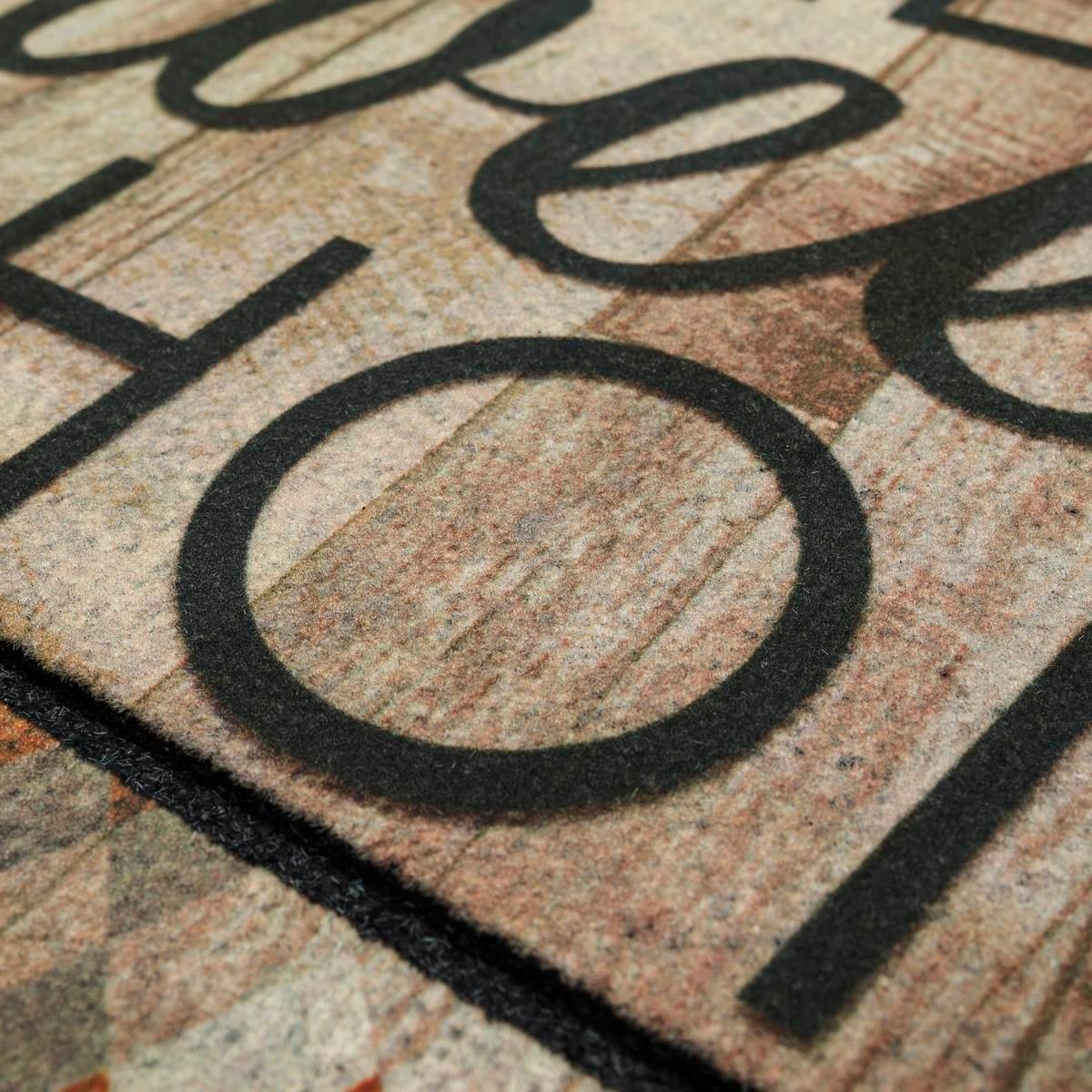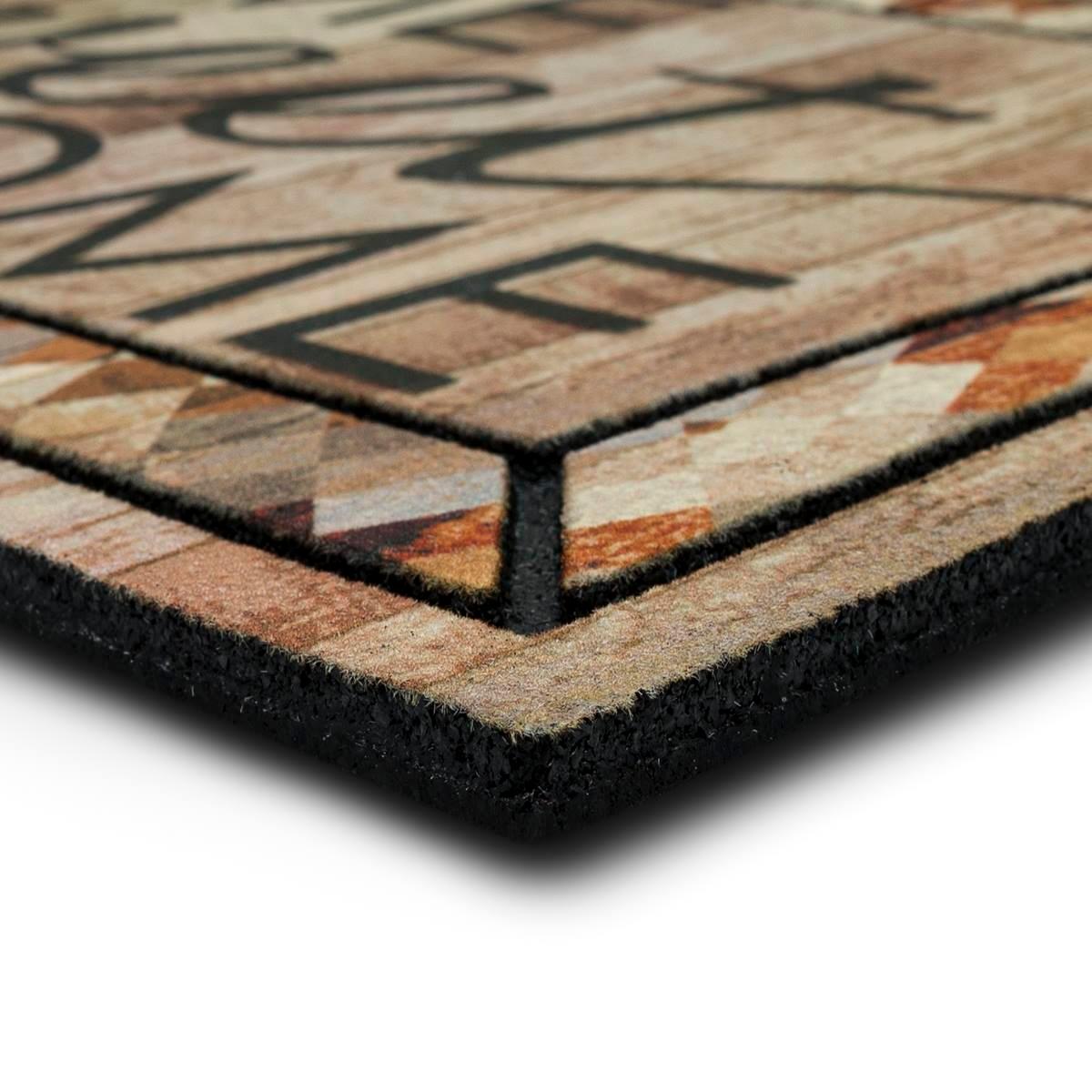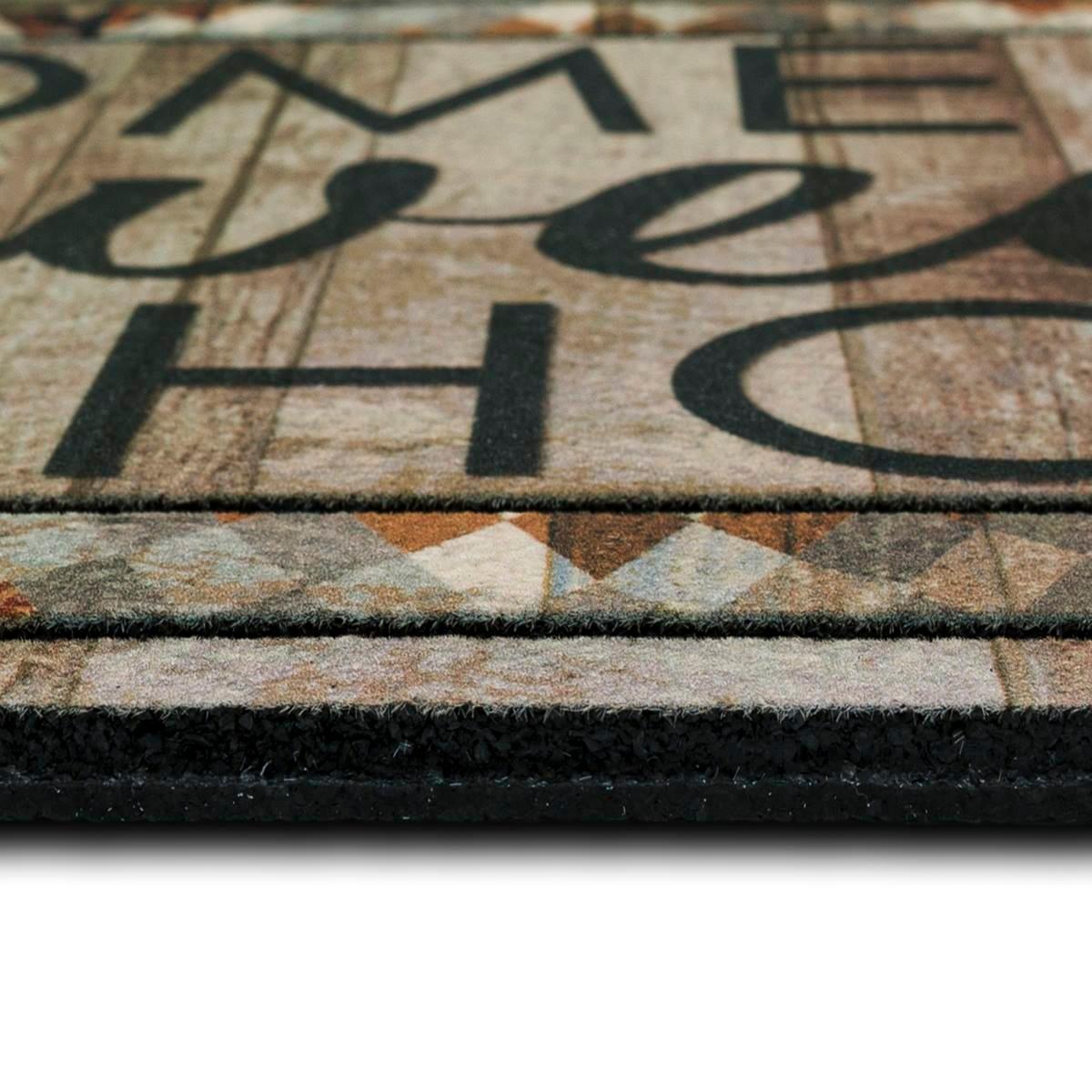 Natural neutral brown woodgrain inspired textures complement the black script print of this Mohawk Home rustic "Home Sweet Home" doormat. Environmentally friendly, the mat is backed with the dependable durability of recycled rubber. It is ideal for scraping dirt from shoes before it´s tracked indoors, helping to keep your indoors beautiful too.