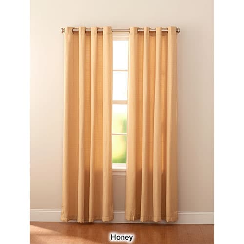 Basket weave panel curtain feature grommets allover for easy opening and closing of curtain. Six colors to choose from to match your décor. 100% Polyester. Machine wash in cold water on gentle cycle. Hang to dry. 1 Panel per package. Sizes: 56x63, 56x84 and 56x95.