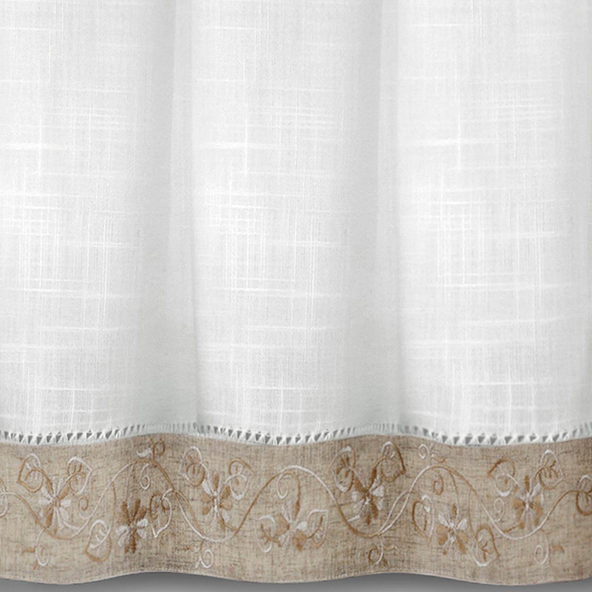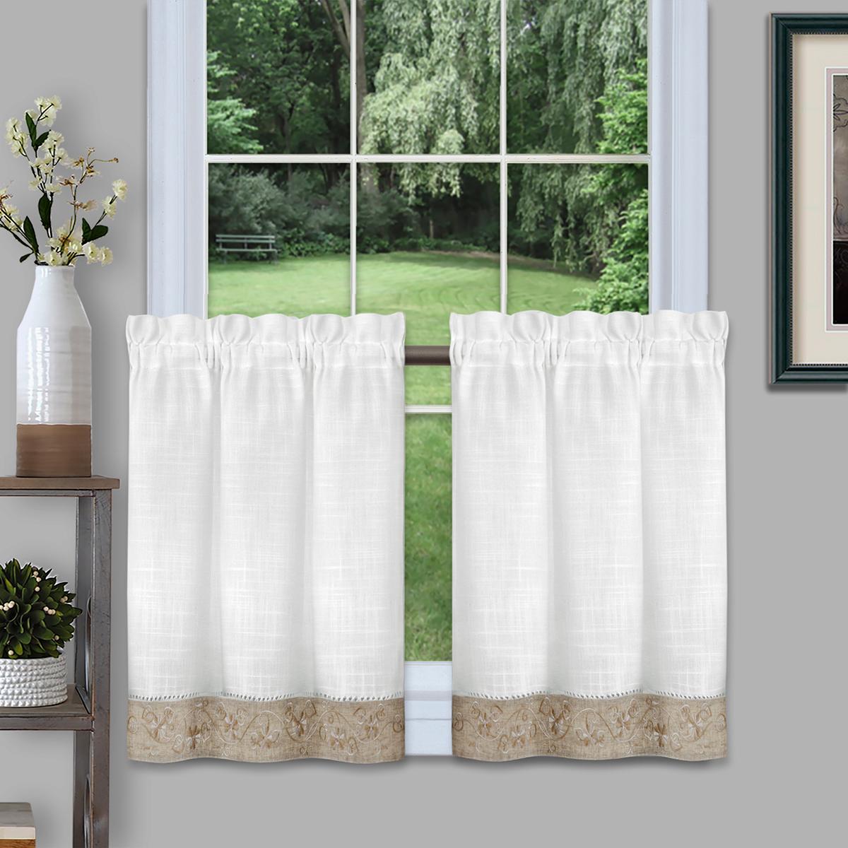 The Achim Oakwood tier curtain features a tailored natural linen look with monochromatic floral embroidery. With rod pockets and easy care, this tier is perfect for any kitchen.