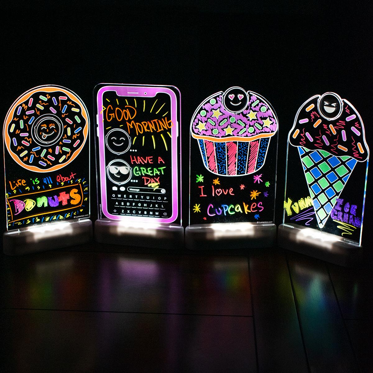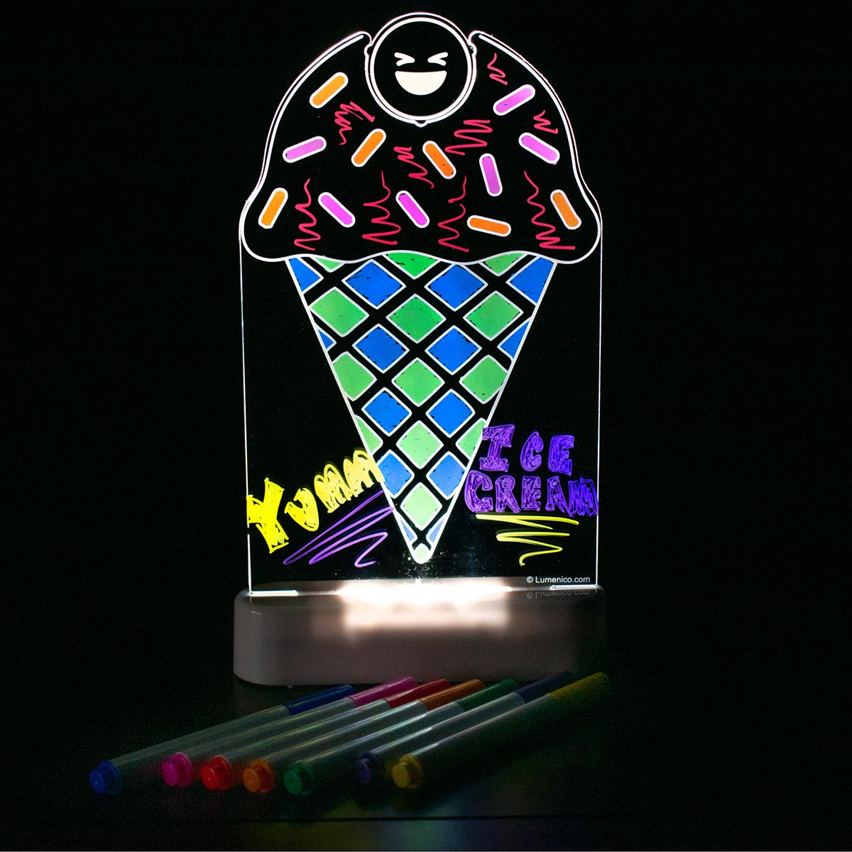 Add the Lumenico Ice Cream Emoji Notes light up craft kit for young artists to your daily routine. Features 7 Emoji disks, 7 pens, and a white LED dimmable base. Color on the screen and turn on the light to see it shine.