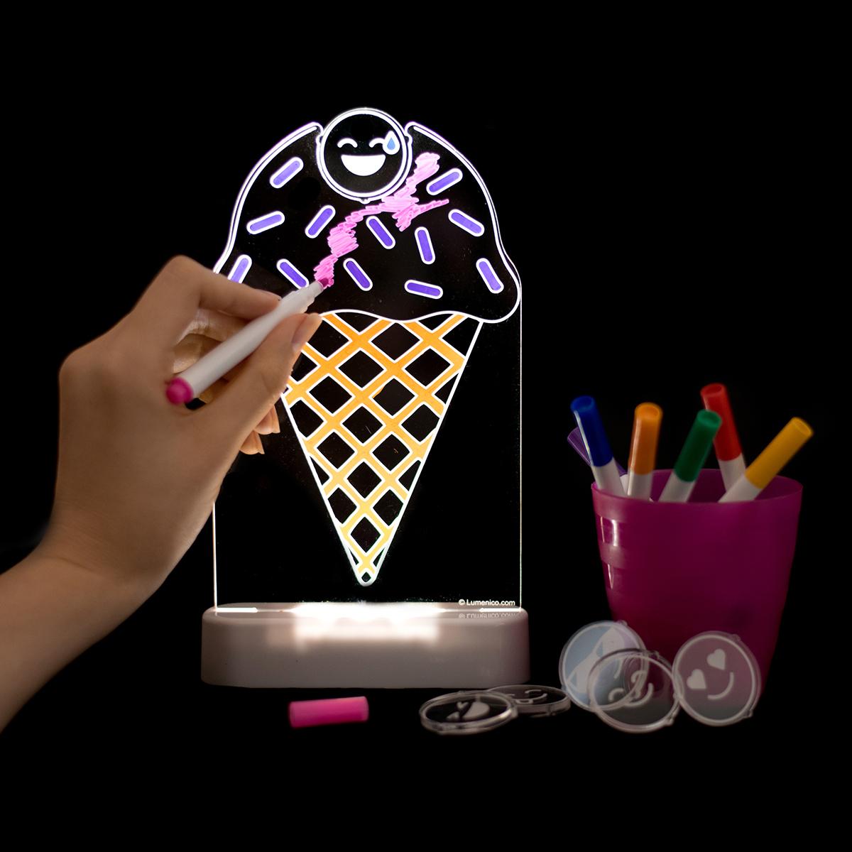 Description Add the Lumenico Ice Cream Emoji Notes light up craft kit for young artists to your daily routine. Features 7 Emoji disks, 7 pens, and a white LED dimmable base....