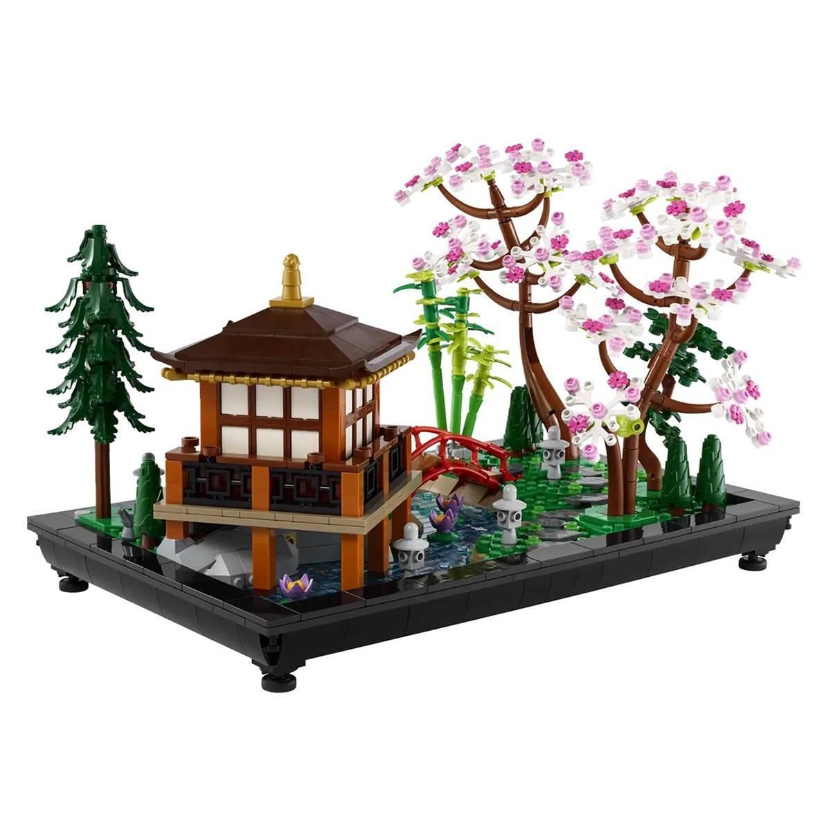 Based on a traditional Japanese garden, this buildable model includes an arched bridge, stream, koi carp, lotus flowers, trees, rocks, stone lanterns, and a pavilion with a detailed tea-ceremony room.