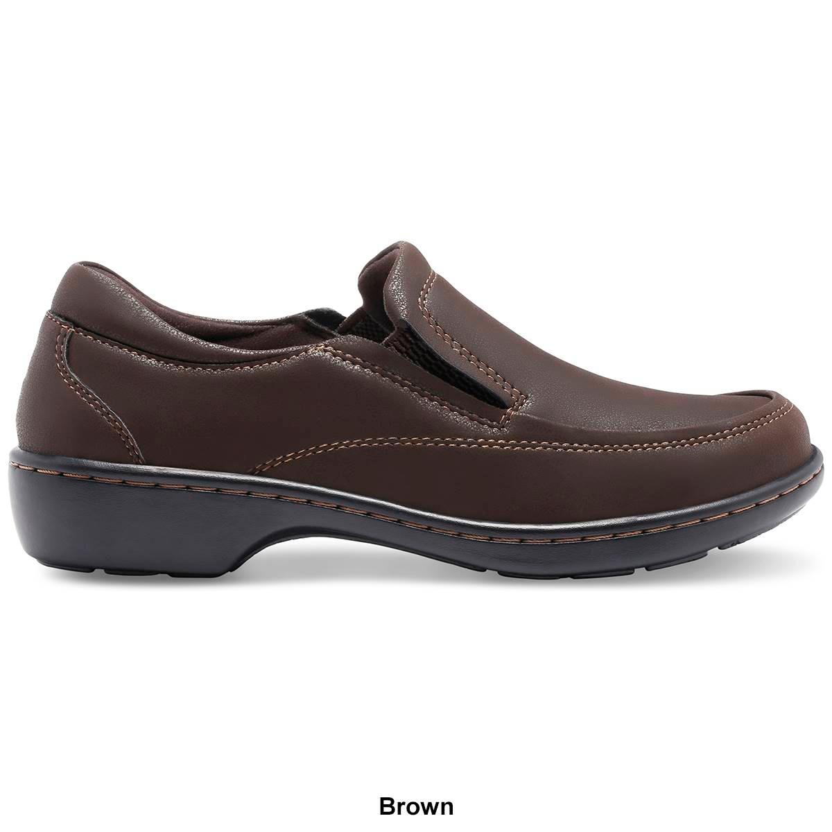 Endure long days on your feet in the comfort of these Womens Eastland Molly moc toe slip on loafers. Featuring a synthetic upper with fabric lining and the dual-side elastic allows for easy on and off with a customized fit. A comfort insole supports and conforms to the curves of your foot and the shock-absorbing Polyurethane outsole offers lightweight durability and traction.