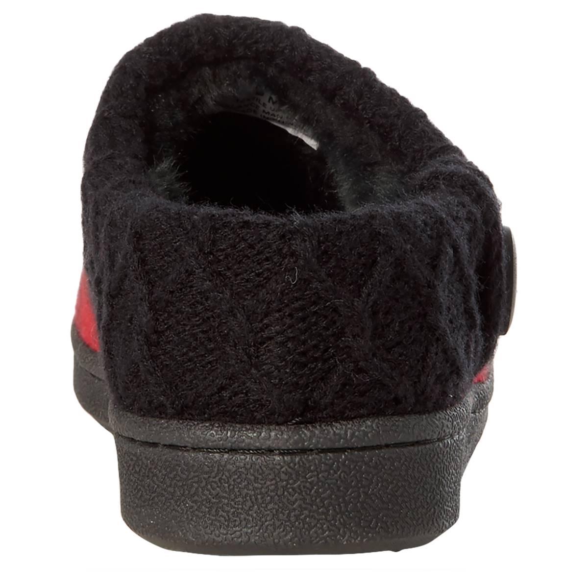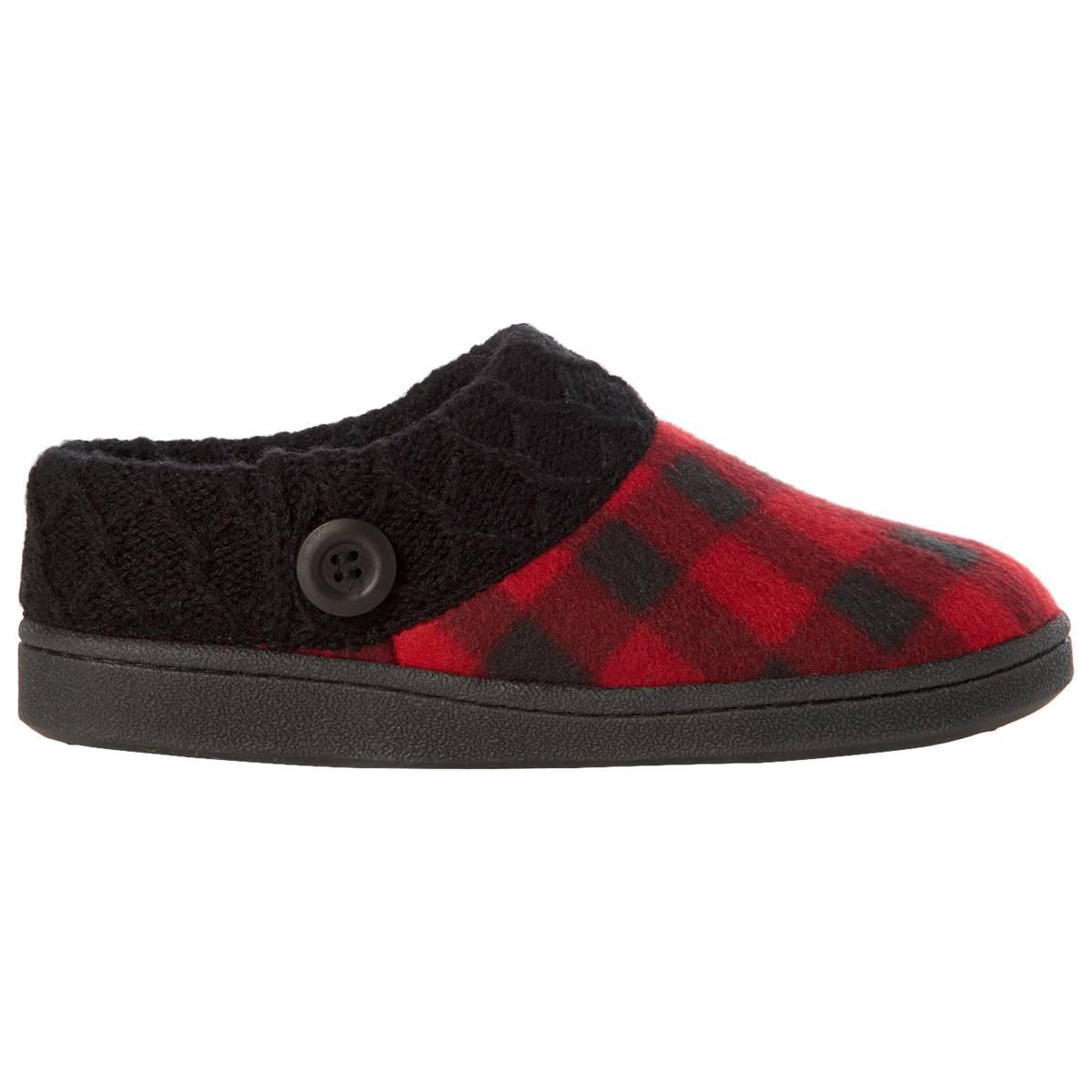 Your in-home styling just got a lot better with the comfortable Womens Clarks® Nikki check plaid scuff slippers. The round-toe design features a super-soft faux-fur lining with a solid sweater knit collar and novelty button detail. Additional detail includes a leather upper and man-made balance outsole.