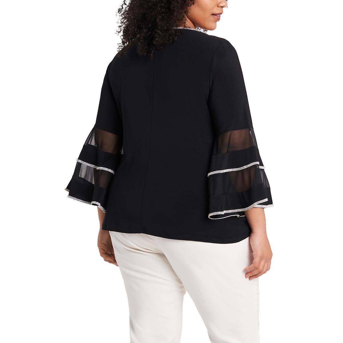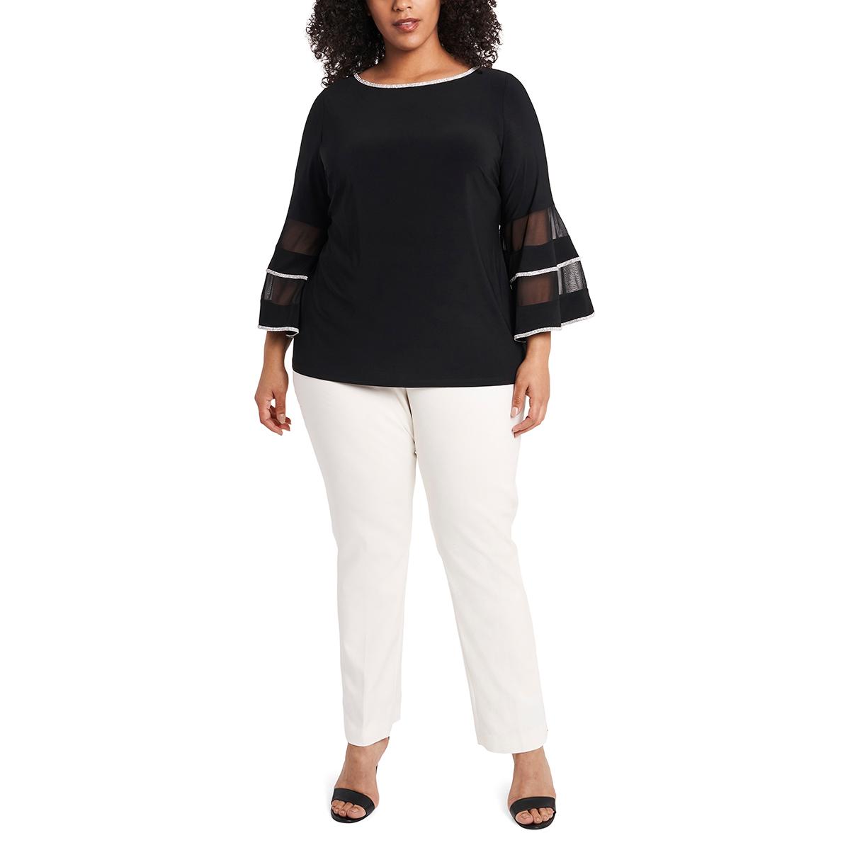 Destined for compliments, this Plus Size MSK rhinestone blouse combines classic elegance with contemporary styling. The result? One chic and blingy look. Features 3/4 bell illusion sleeves and a boat neckline.