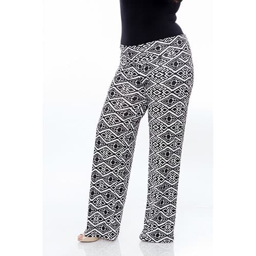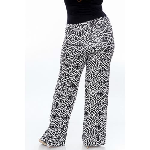 The Plus Size White Mark printed palazzo pants offer a super comfortable wide leg design. They are great for all body types and will easily be the go to piece in your closet. 95% Polyester, 5% Spandex. Hand wash. Line dry. Inseam: 33 inches.