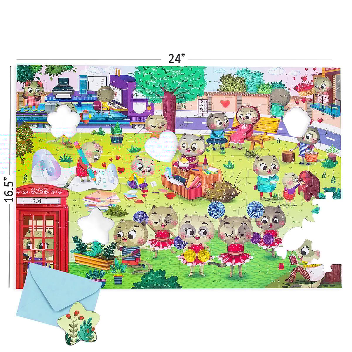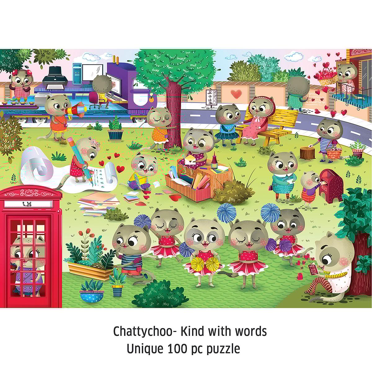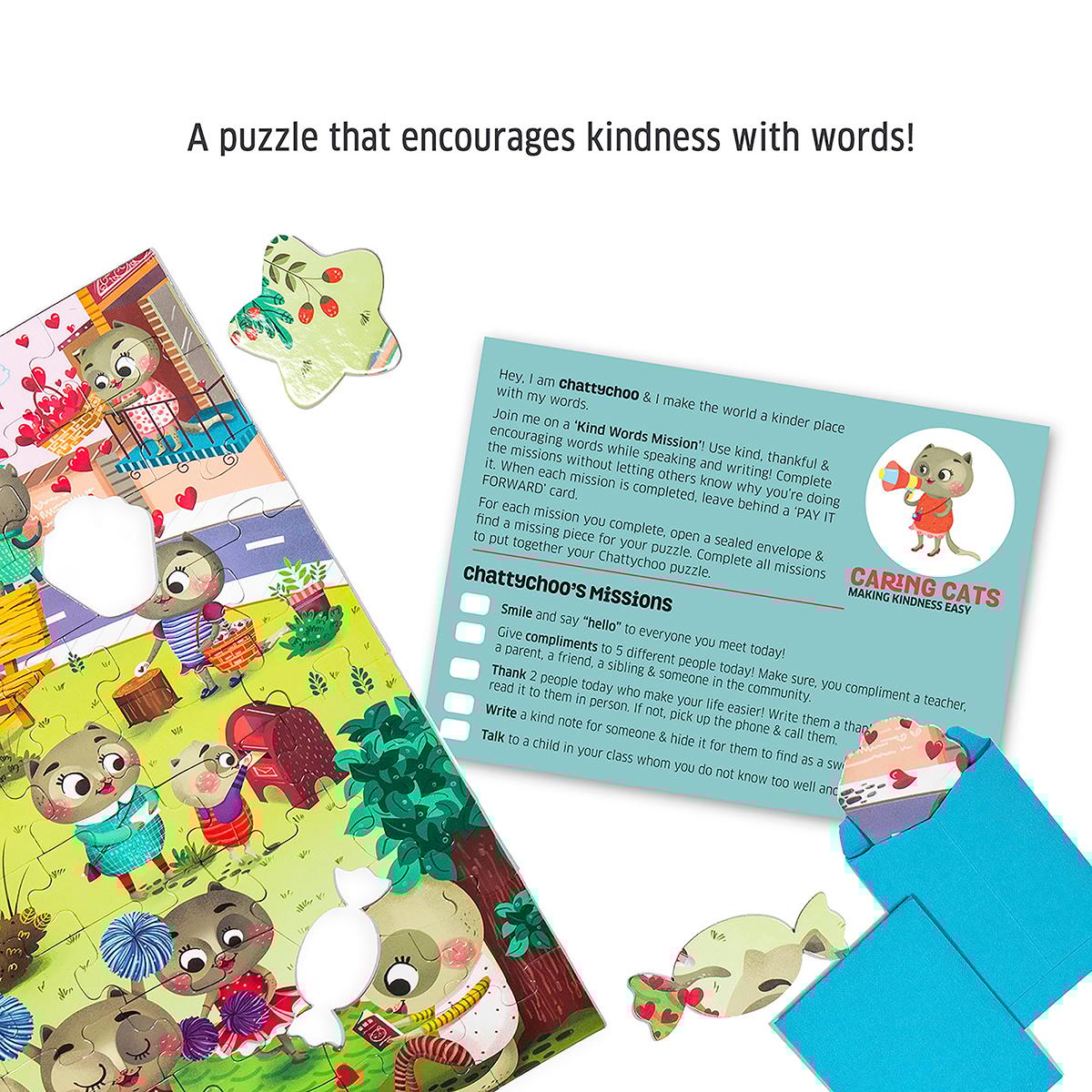 This Chalk N Chuckles Chatty Choo 100-piece jigsaw puzzle has large sturdy pieces perfect for children. A beautiful puzzle with a twist! When completed, the puzzle will have 5 pieces missing. Complete 5 kind and caring missions and open sealed envelopes to find all the missing pieces to complete your puzzle.