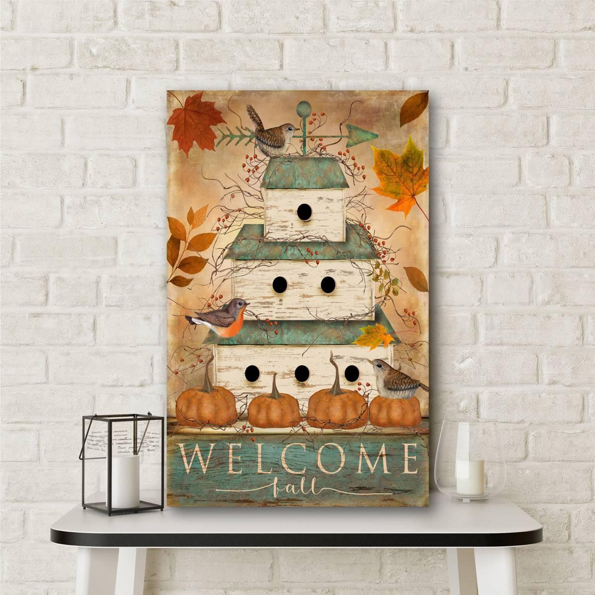 This Courtside Market "Welcome Fall" birdhouse piece features beautiful, high-quality gallery-wrapped canvas wall art. The professional artist-grade canvas is professionally wrapped around warp-resistant, structurally engineered 1.5-inch stretcher bars to maintain structural integrity. Made with genuine high-end precision printing technology utilizing nine colors of ink that achieves a superior print every time.